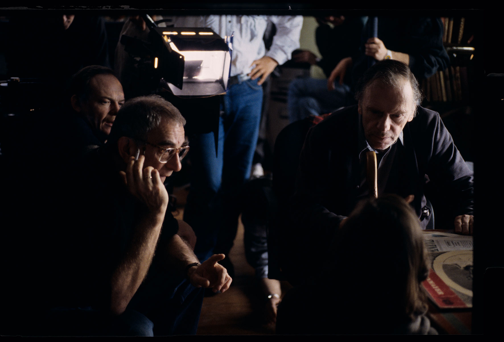 Plan zdjęciowy w mieszkaniu sędziego. Krzysztof Kieślowski (reżyser) udziela wskazówek aktorom Jean-Louisowi Trintignantowi i Irene Jacob.