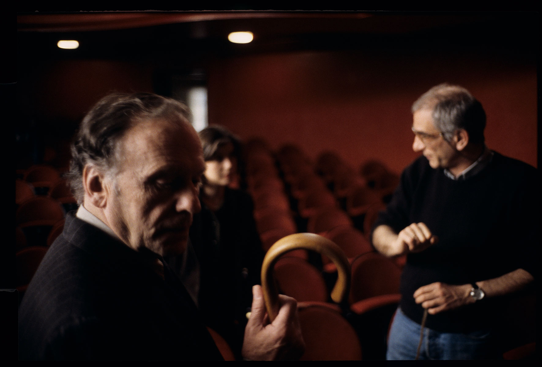 Krzysztof Kieślowski (reżyser), Irene Jacob (aktorka odtwarzająca rolę Valentine) oraz Jean-Louis Trintignant (odtwórca roli sędziego Josepha Kerna) na planie zdjęciowym w teatrze po pokazie mody.