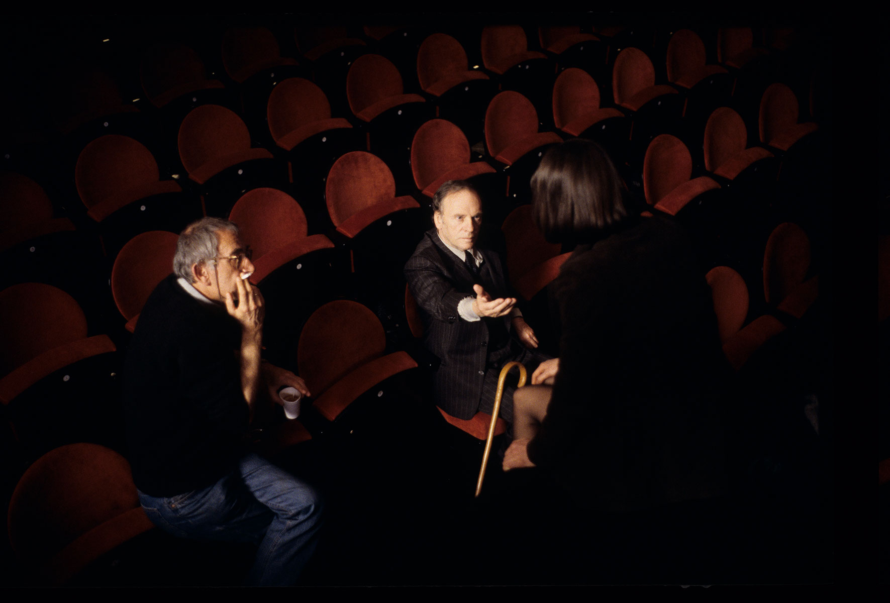 Plan zdjęciowy w teatrze podczas spotkania sędziego i Valentine po pokazie mody. Na zdjeciu widoczni: Krzysztof Kieślowski (reżyser), Irene Jacob (odtwórczyni roli Valentine), Jean-Louis Trintignant (jako emerytowany sędzia Joseph Kern).