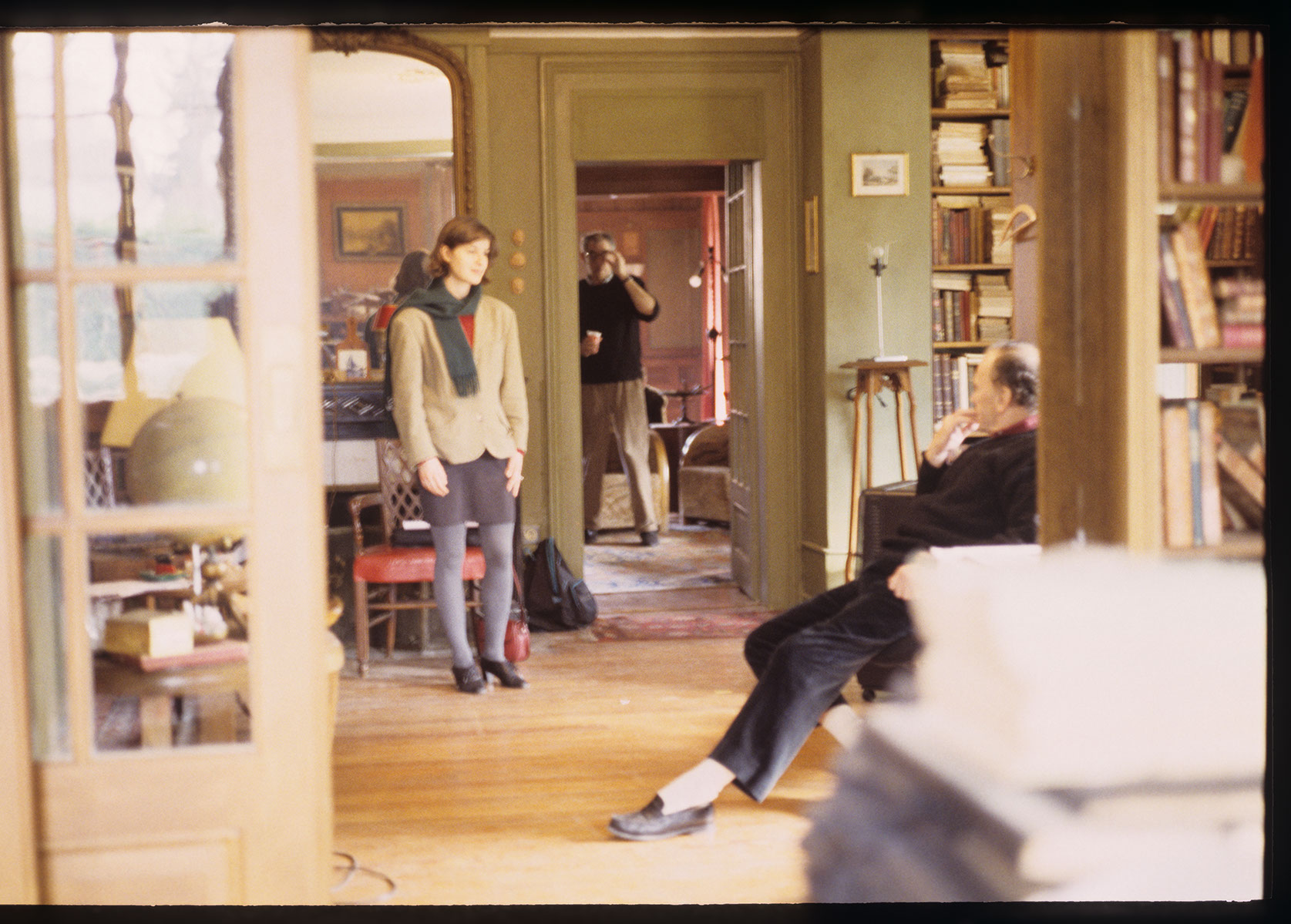 Krzysztof Kieślowski (reżyser) obserwuje grę aktorów Irene Jacob (Valentine) i Jean-Louisa Trintignanta (sędzia Joseph Kern) na planie zdjęciowym w domu sędziego.