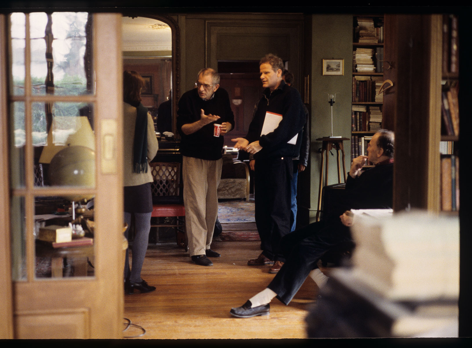 Krzysztof Kieślowski (reżyser), Roman Gren (tłumacz) i Jean-Louis Trintignant (odtwórca roli sędziego Josepha Kerna) na planie zdjęciowym w domu sędziego. Krzysztof Kieślowski udziela wskazówek Irene Jacob (odtwórczyni głównej roli), która stoi tyłem do kadru