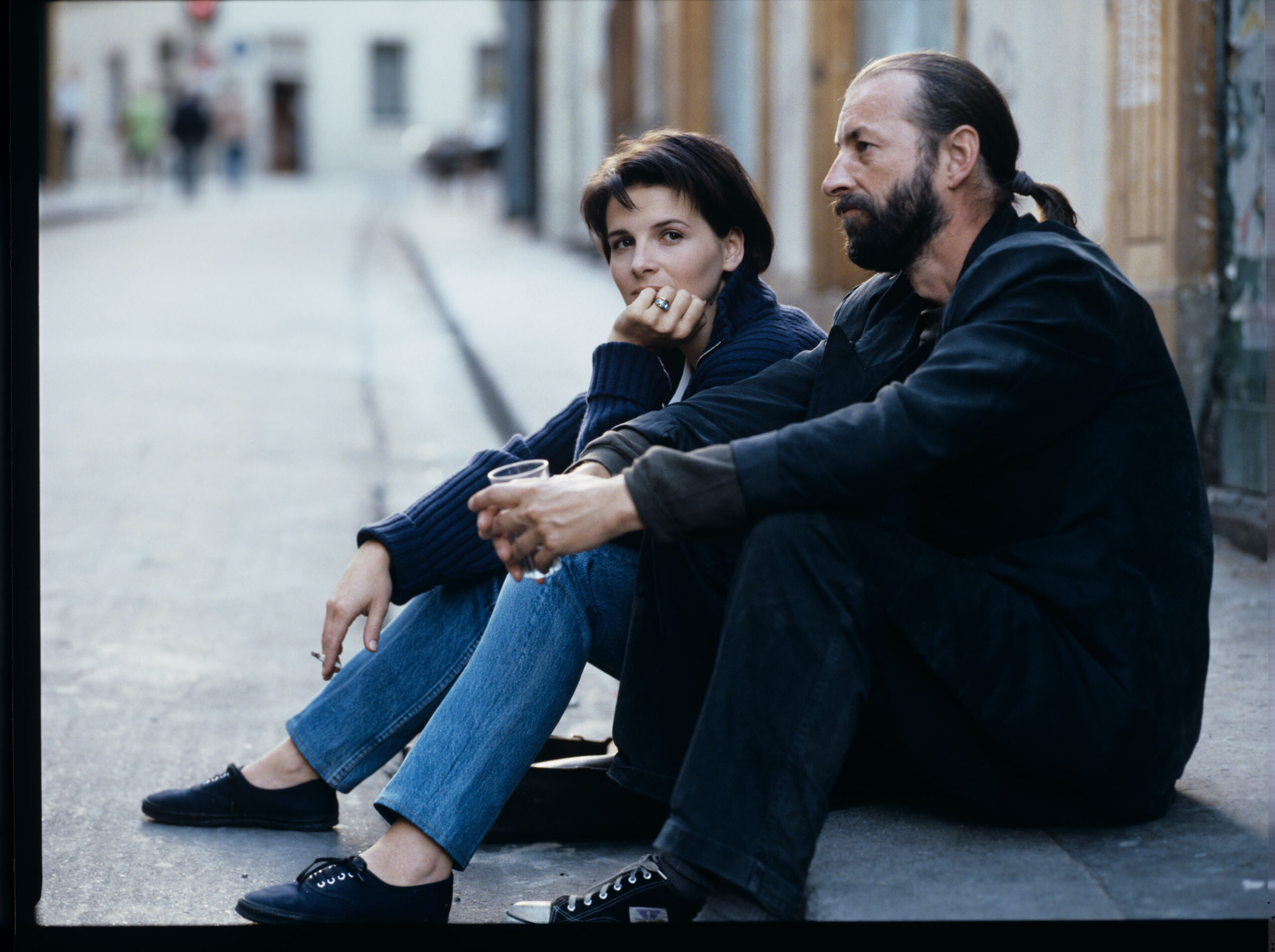 Julie (Juliette Binoche) rozmawia z ulicznym flecistą (w tej roli Jacek Ostaszewski – polski kompozytor i muzyk jazzowy).