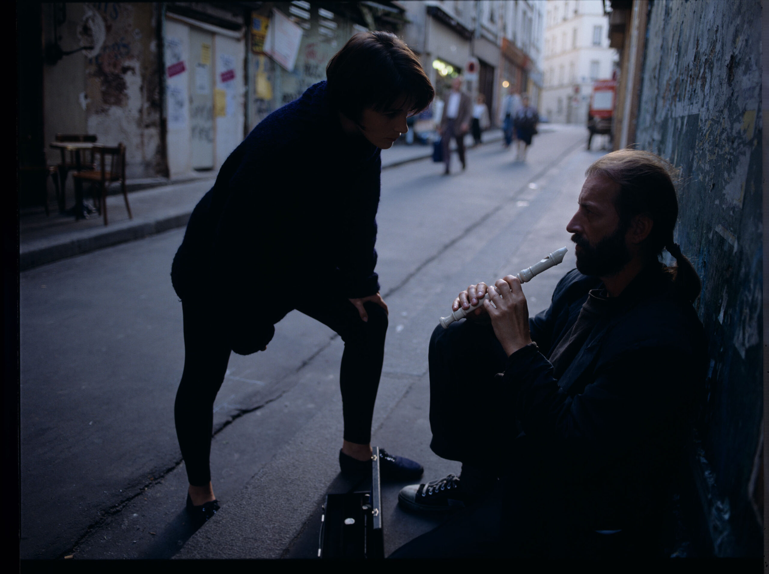 Julie (Juliette Binoche) rozmawia z ulicznym flecistą (w tej roli Jacek Ostaszewski – polski kompozytor i muzyk jazzowy).