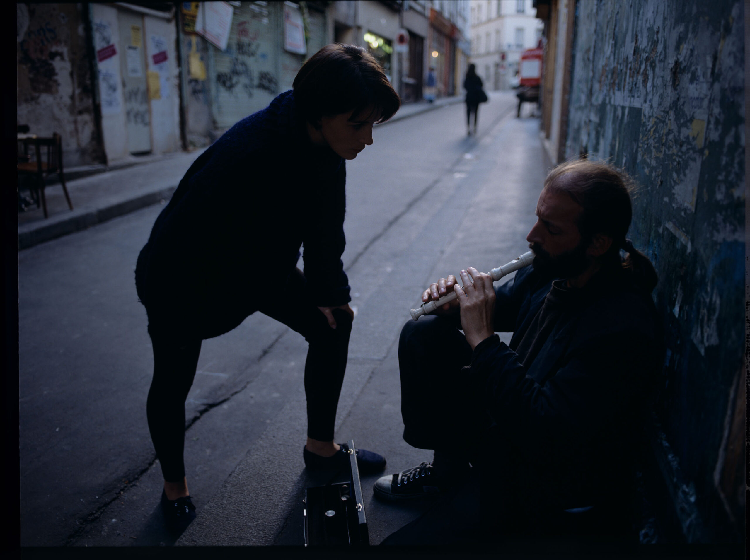 Julie (Juliette Binoche) rozmawia z ulicznym flecistą (w tej roli Jacek Ostaszewski – polski kompozytor i muzyk jazzowy).