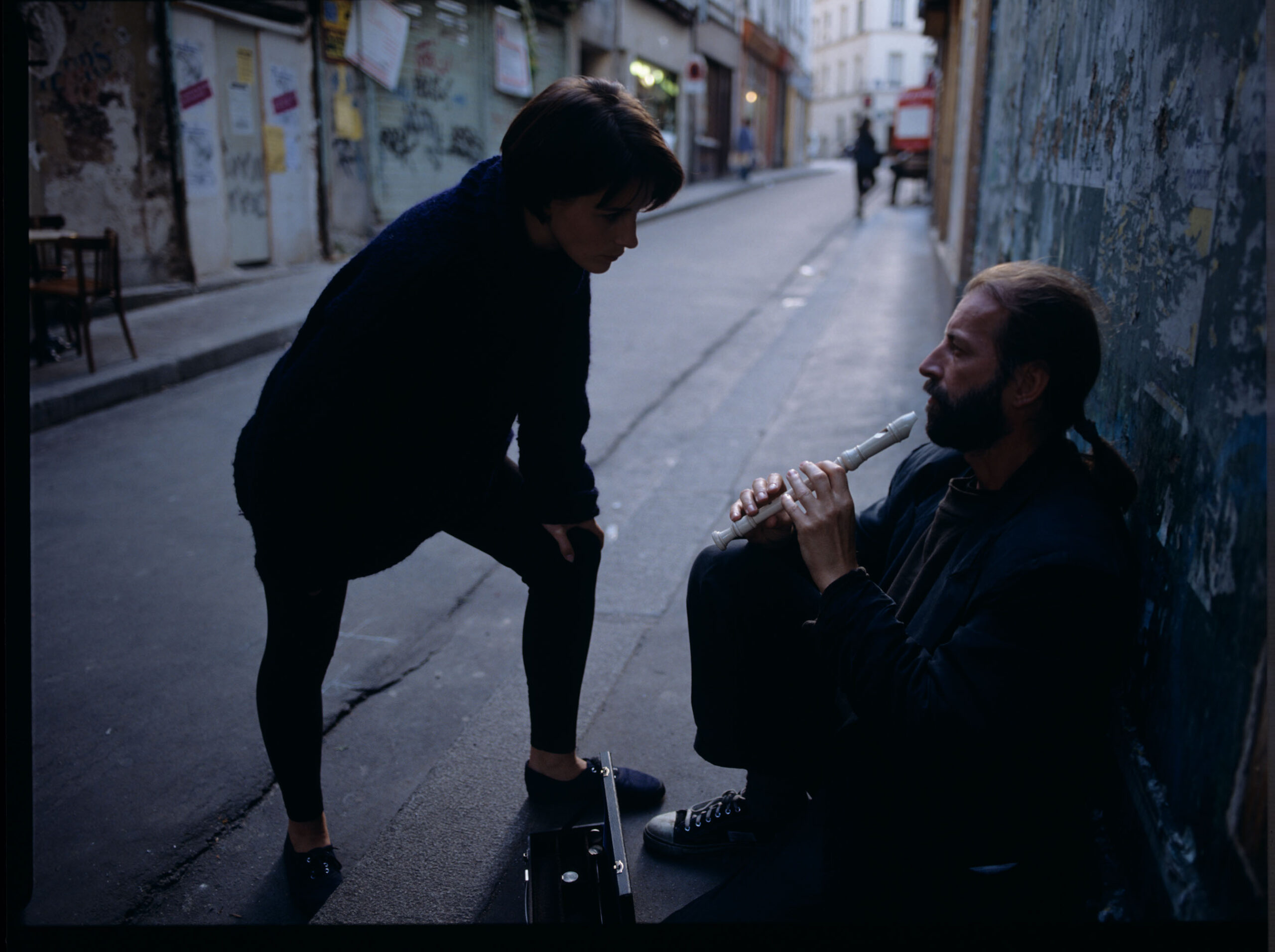 Julie (Juliette Binoche) rozmawia z ulicznym flecistą (w tej roli Jacek Ostaszewski – polski kompozytor i muzyk jazzowy).