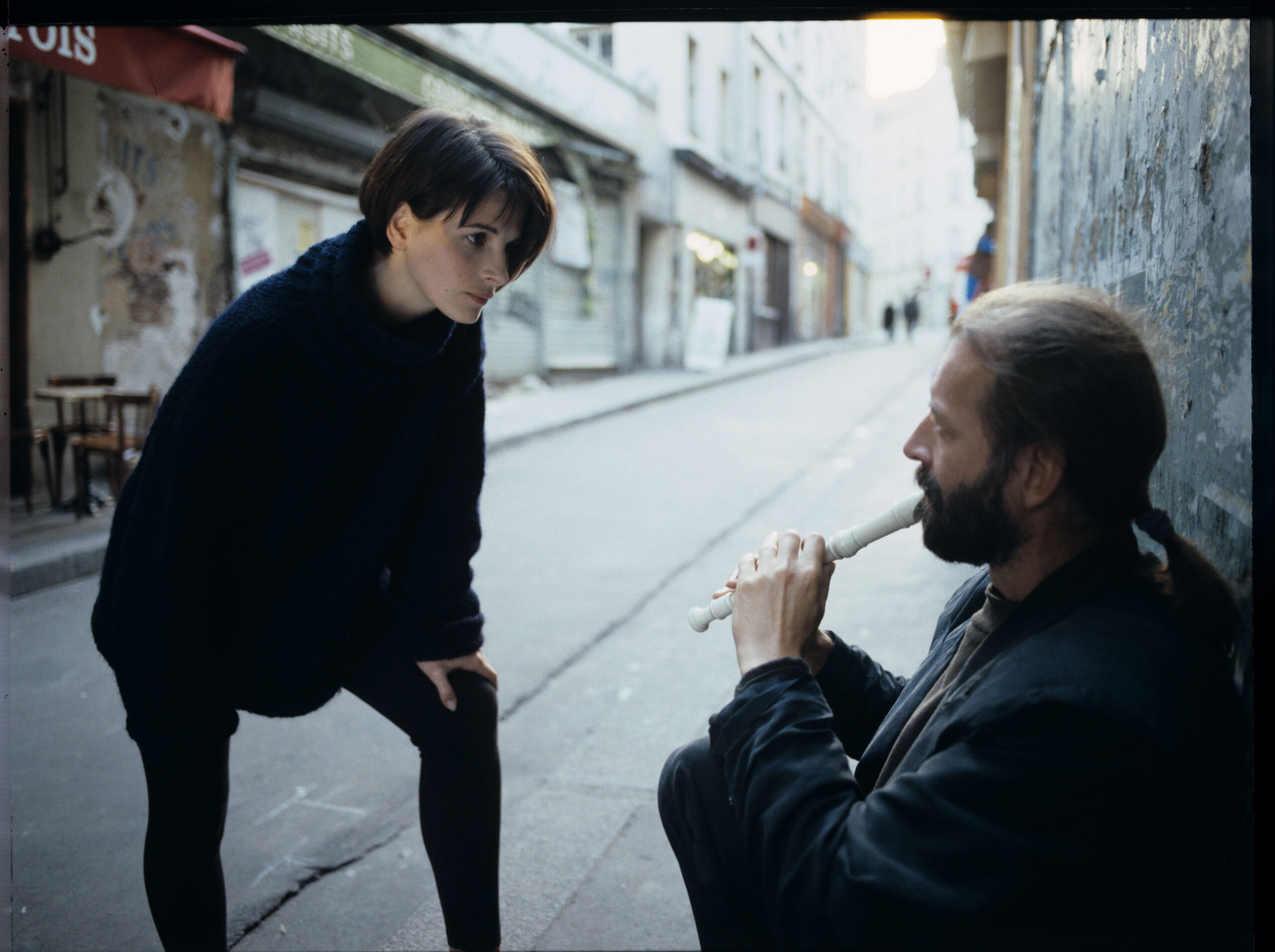 Julie (Juliette Binoche) rozmawia z ulicznym flecistą (w tej roli Jacek Ostaszewski – polski kompozytor i muzyk jazzowy).
