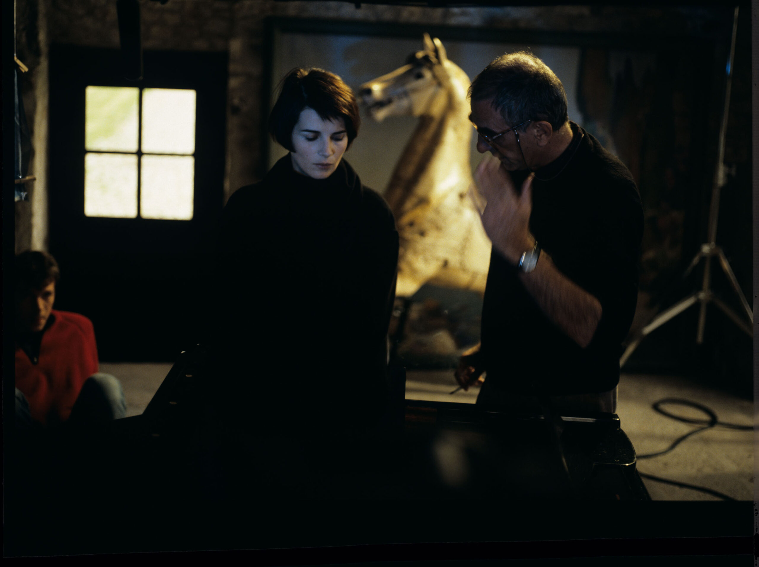 Krzysztof Kieślowski (reżyser) udziela wskazówek aktorce Juliette Binoche podczas kręcenia sceny przybycia Julie do jej podparyskiej posiadłości po powrocie ze szpitala.