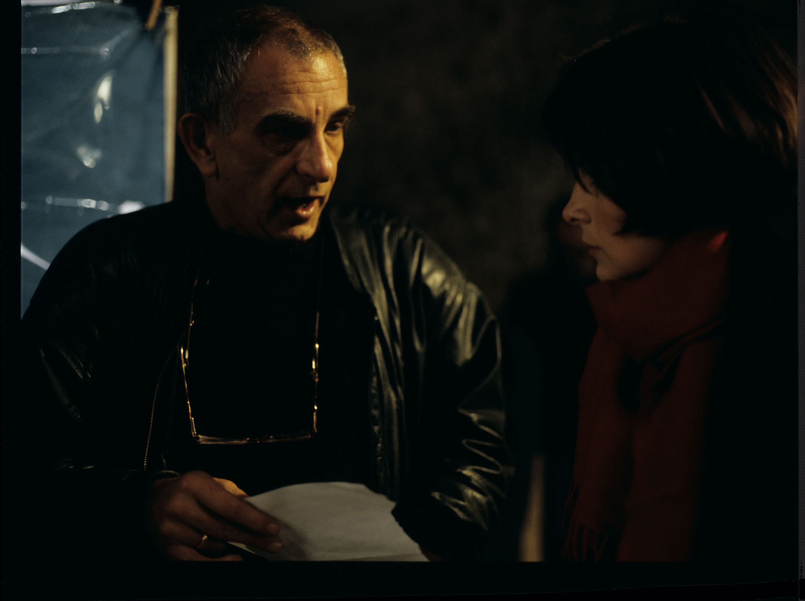 Krzysztof Kieślowski (reżyser) rozmawia z aktorką Juliette Binoche na planie zdjęciowym.
