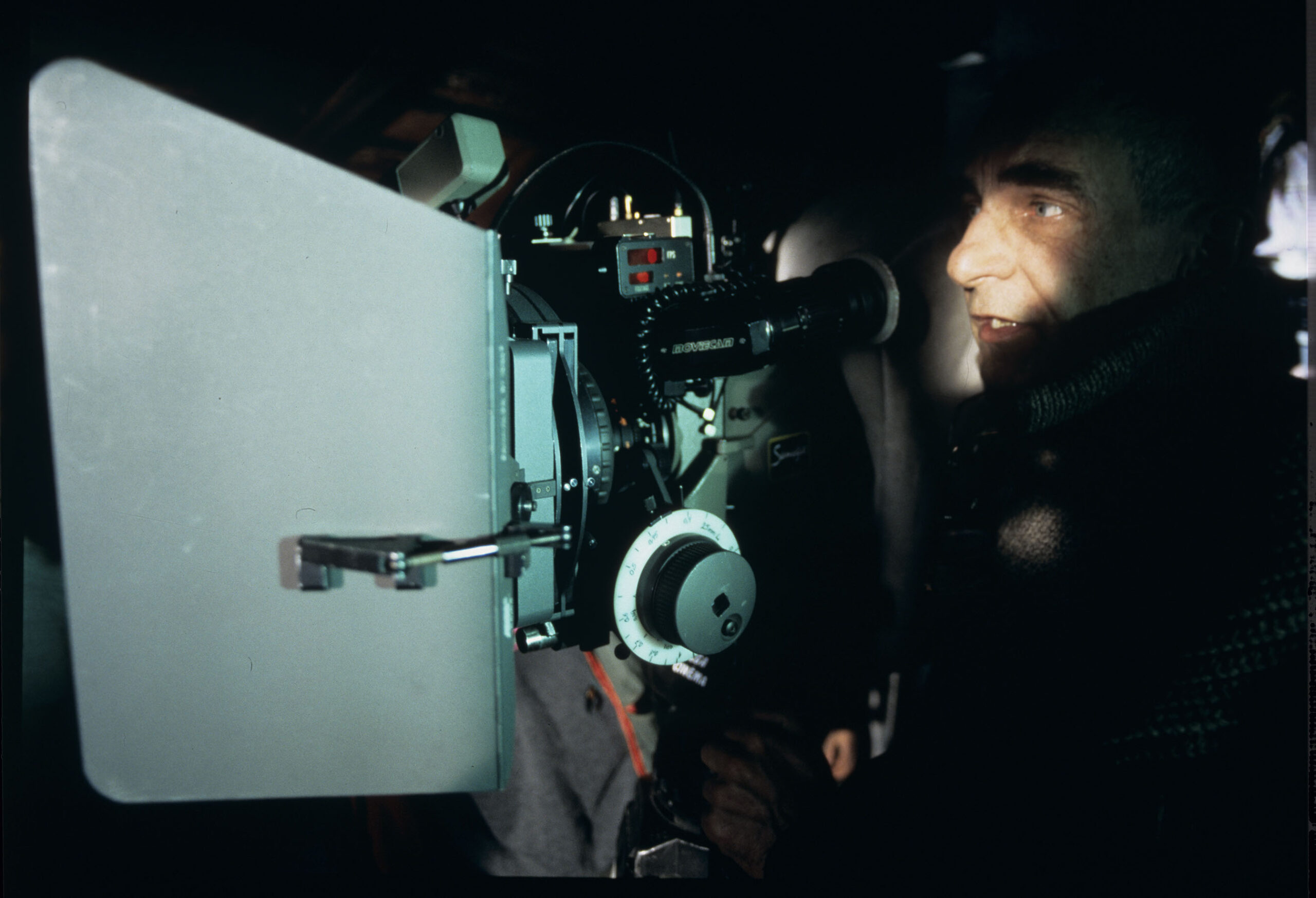 Krzysztof Kieślowski (reżyser) przy kamerze na planie zdjęciowym.