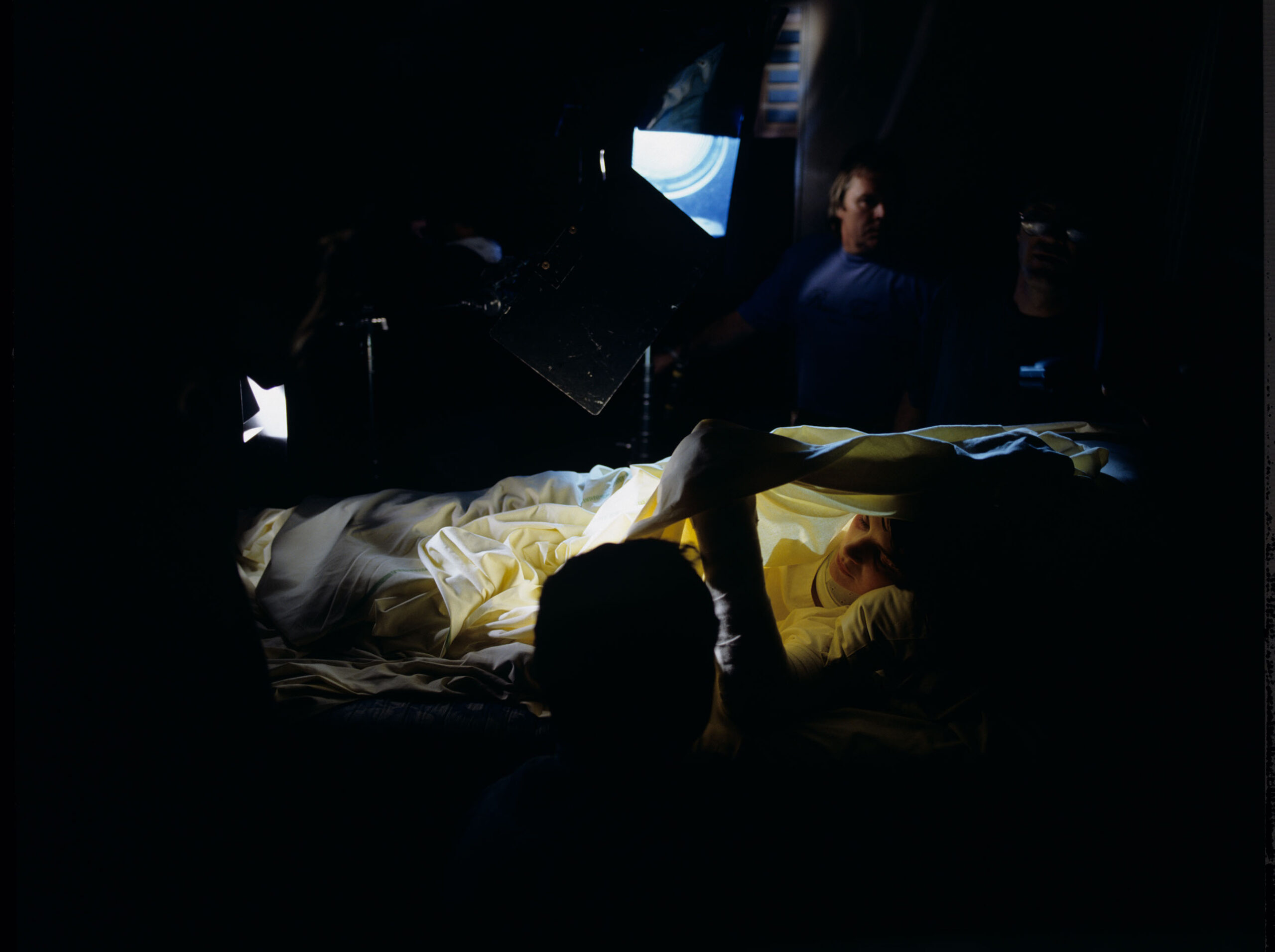 Plan zdjęciowy w sali szpitalnej, gdzie Julie, schowana pod prześcieradłem, ogląda relację z pogrzebu swojego męża i córki na przenośnym telewizorku. Na zdjęciu aktorka Juliette Binoche (jako Julie) i Krzysztof Kieślowski (reżyser).