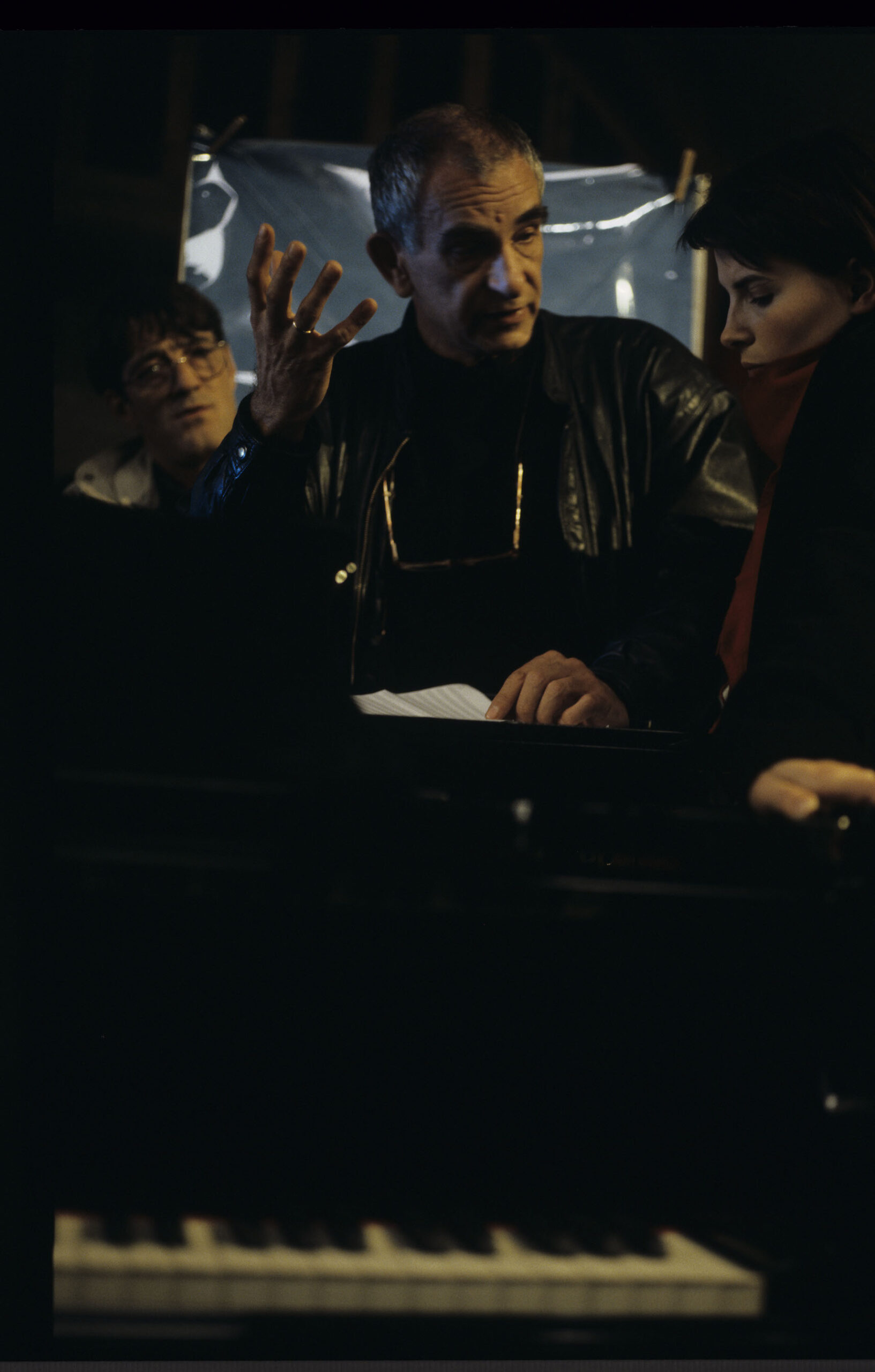 Krzysztof Kieślowski (reżyser) udziela wskazówek aktorce Juliette Binoche na planie zdjęciowym. Na zdjęciu widoczny również Michael Charvaz (rekwizytor).