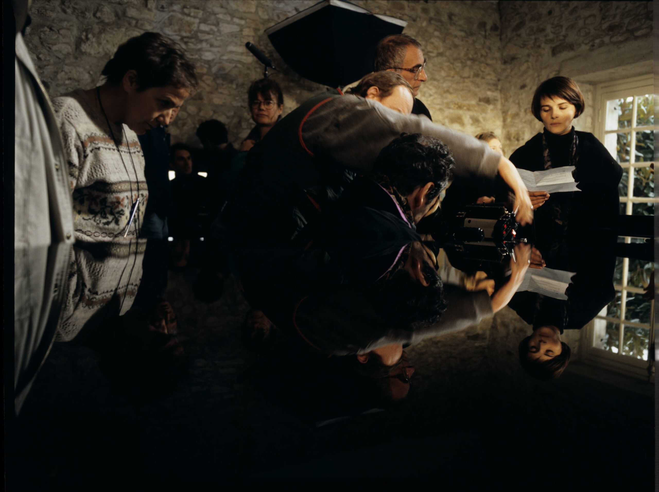 Kręcenie sceny w salonie podmiejskiej posiadłości rodziny de Courcy, kiedy Julie odnajduje kartkę z zapisem nut finalnego fragmentu oratorium “Pieśń na cześć zjednoczonej Europy” autorstwa jej zmarłego tragicznie męża. Na zdjęciu: Juliette Binoche (odtwórczyni roli Julie), Krzysztof Kieślowski (reżyser), Sławomir Idziak (operator), Henryk (asystenci operatora), Genevieve Dufour (sekretarka planu), Brigitte Taillandier (operator dźwięku).