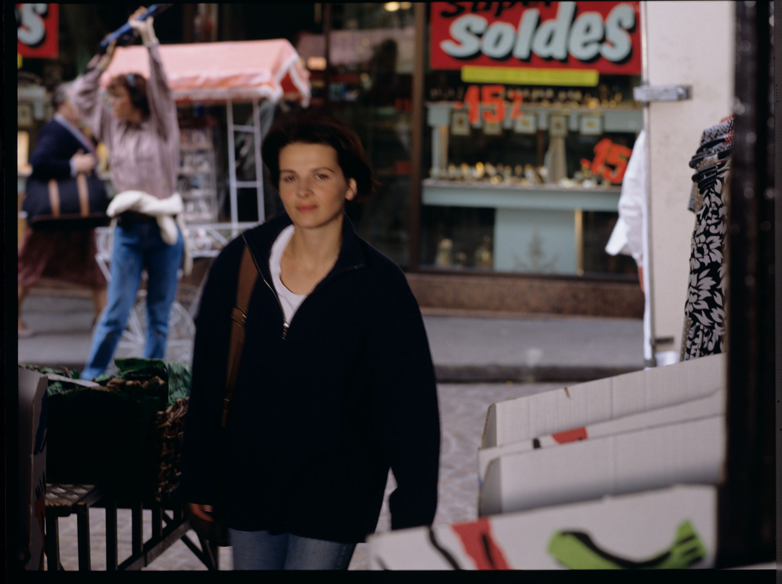 Juliette Binoche (jako Julie) w scenie na paryskiej ulicy. Za nią podąża Brigitte Taillanier (operator dźwięku).