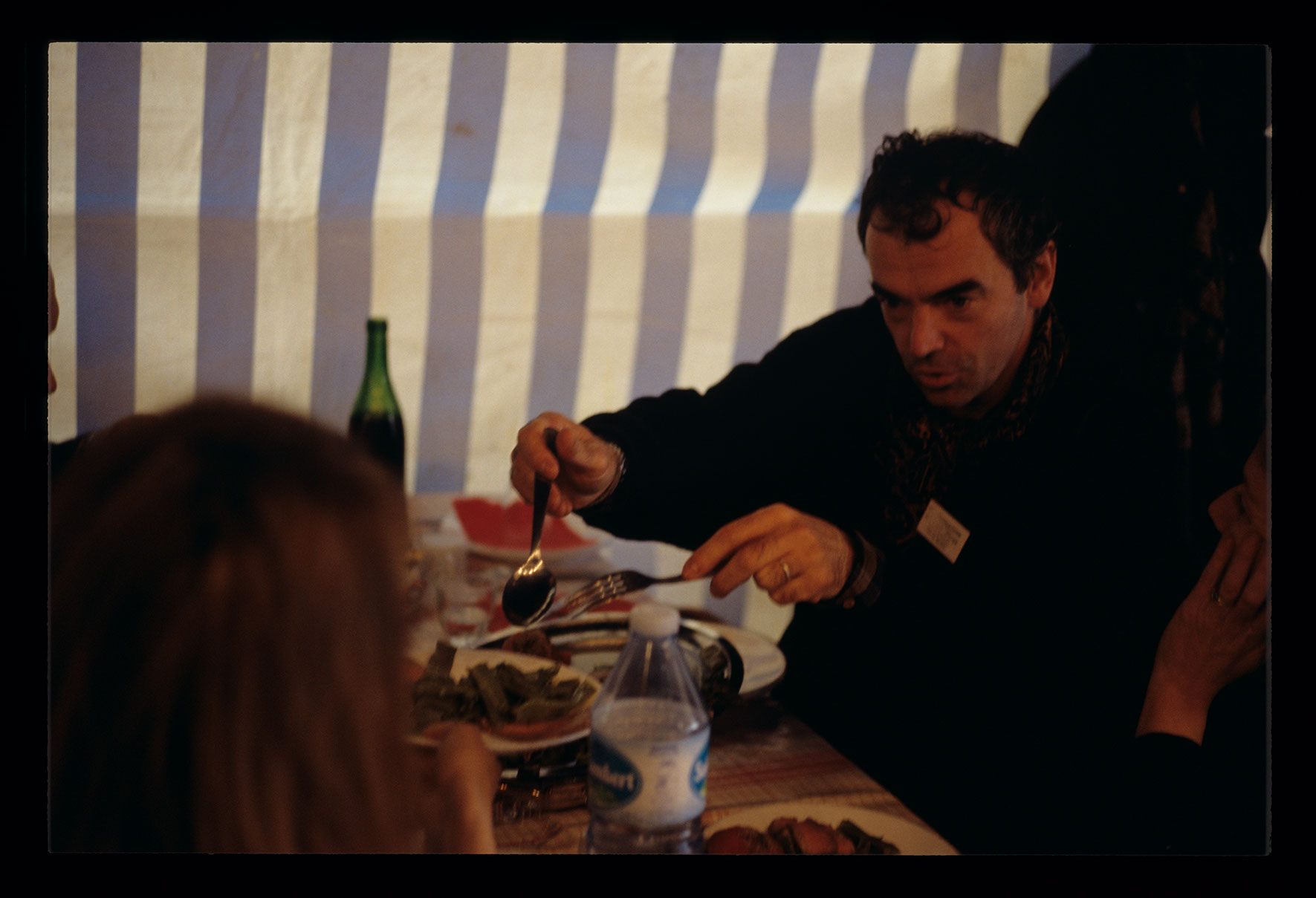 Przerwa między zdjęciami. Sławomir Idziak (operator) podczas posiłku w namiocie dla ekipy.