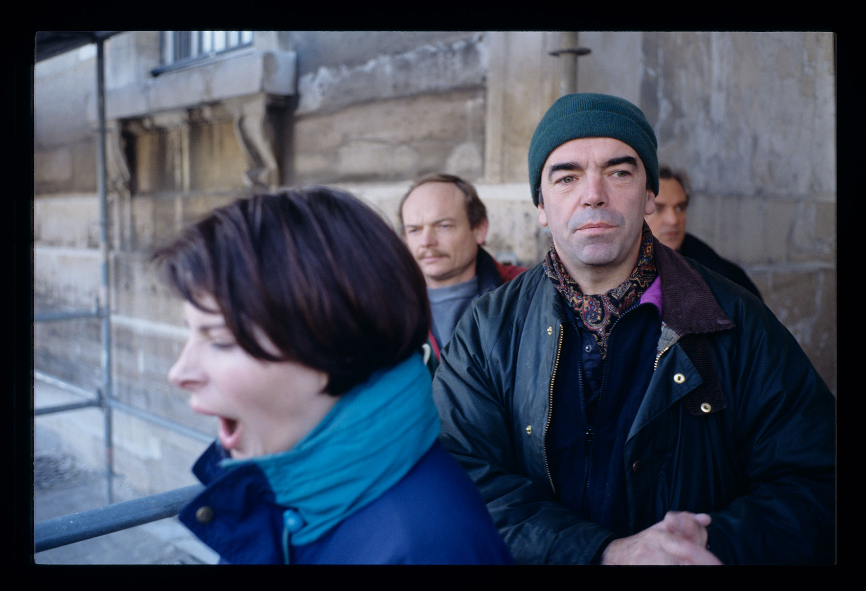 Juliette Binoche (aktorka, odtwórczyni roli Julie), Sławomir Idziak (operator) i Henryk Jedynak (współpraca operatorska) w oczekiwaniu na rozpoczęcie zdjęć na planie filmowym.