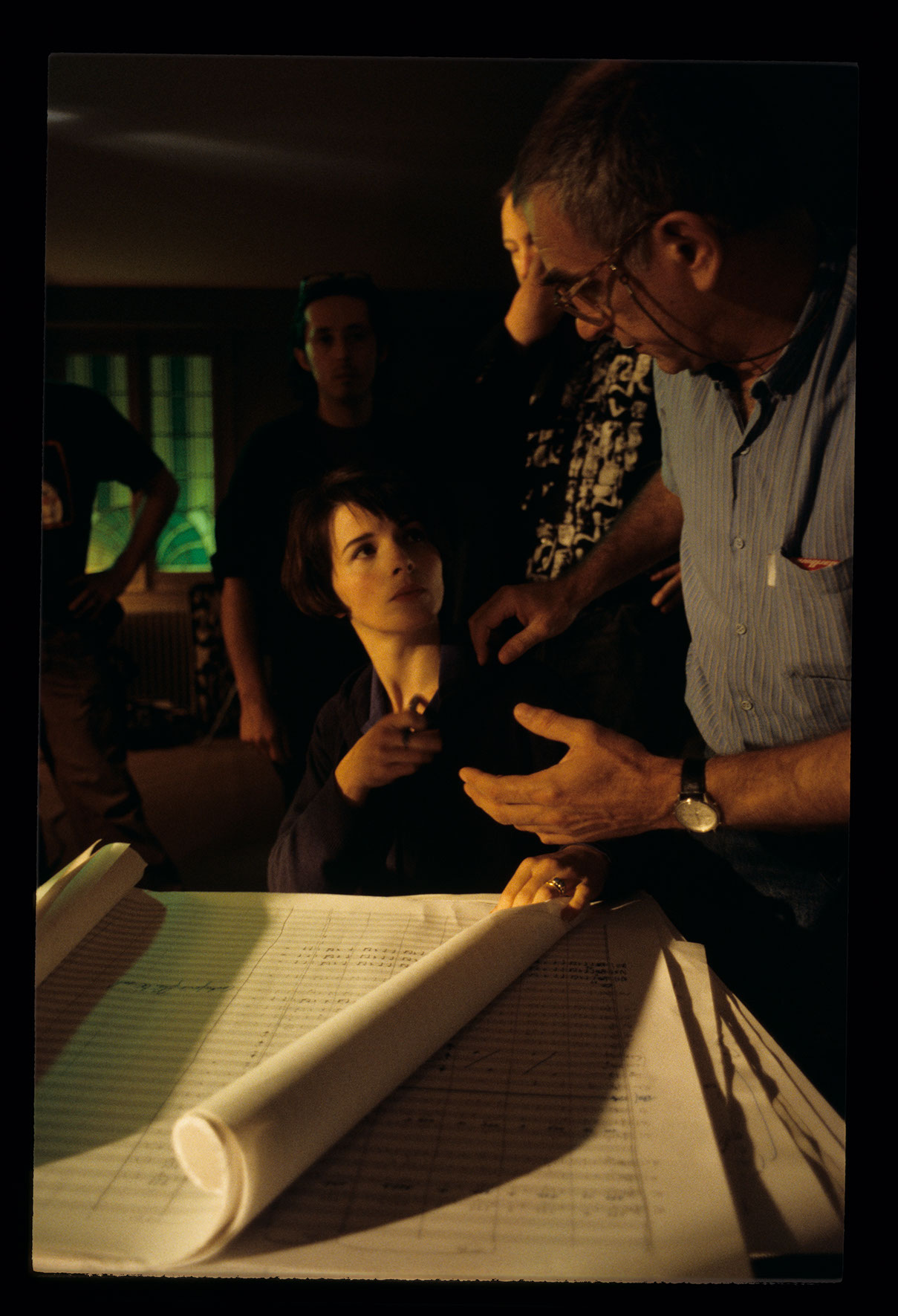 Przygotowania do realizacji sceny kończenia przez Julie kompozycji jej tragicznie zmarłego męża na koncert z okazji zjednoczenia państw Europy. Na zdjęciu aktorka Juliette Binoche jako Julie, Krzysztof Kieślowski (reżyser).