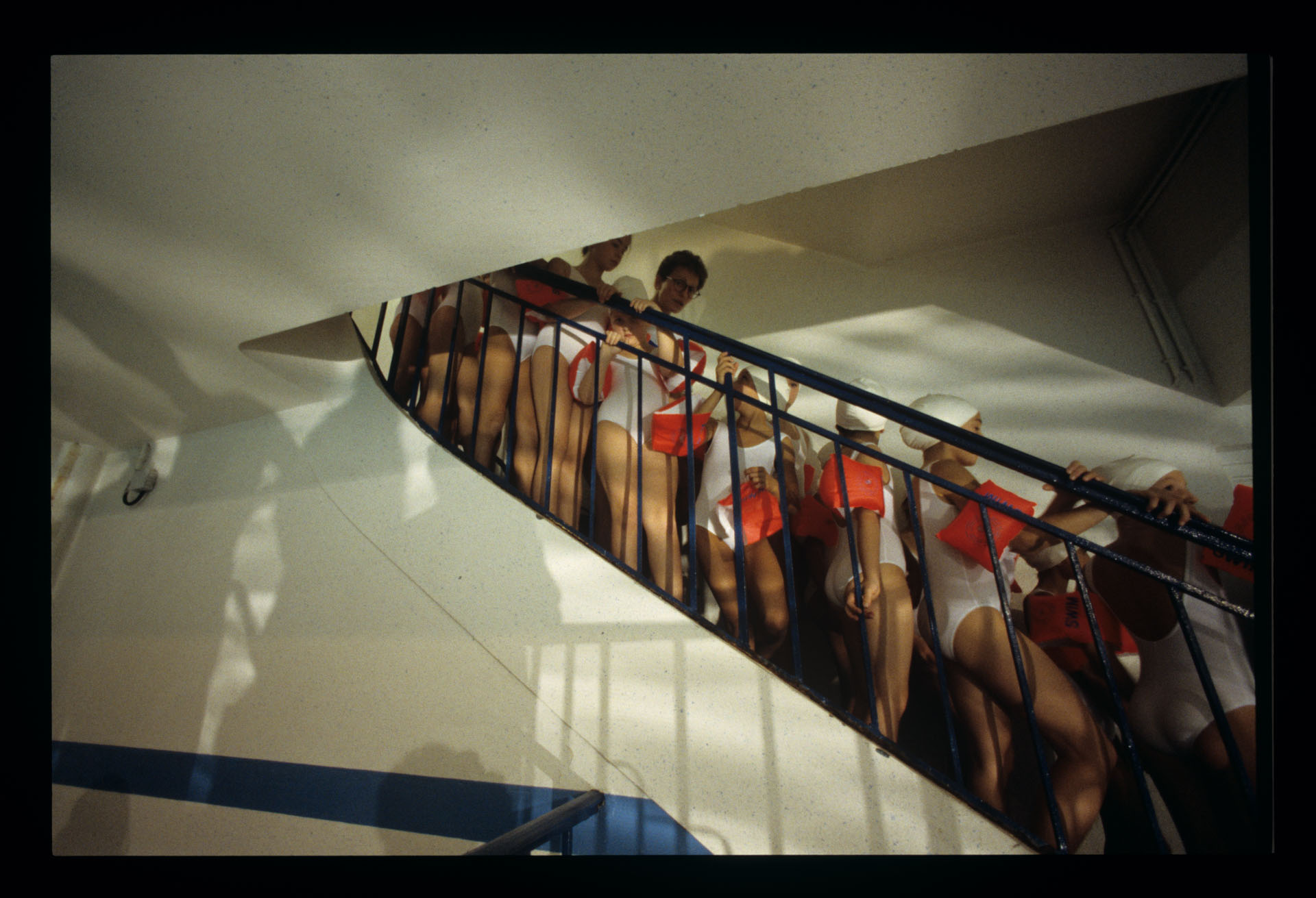 Grupa dziewczynek z sekcji pływackiej na basenie Piscine Pontoise w Paryżu, na schodach prowadzących na basen, oczekujących na realizację sceny, w której biorą udział.