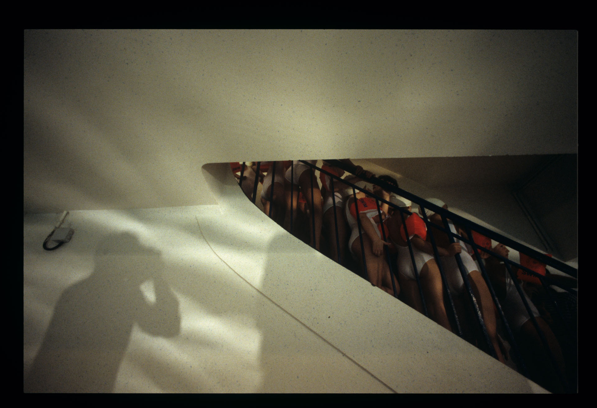 Grupa dziewczynek z sekcji pływackiej na basenie Piscine Pontoise w Paryżu, na schodach prowadzących na basen, oczekujących na realizację sceny, w której biorą udział.