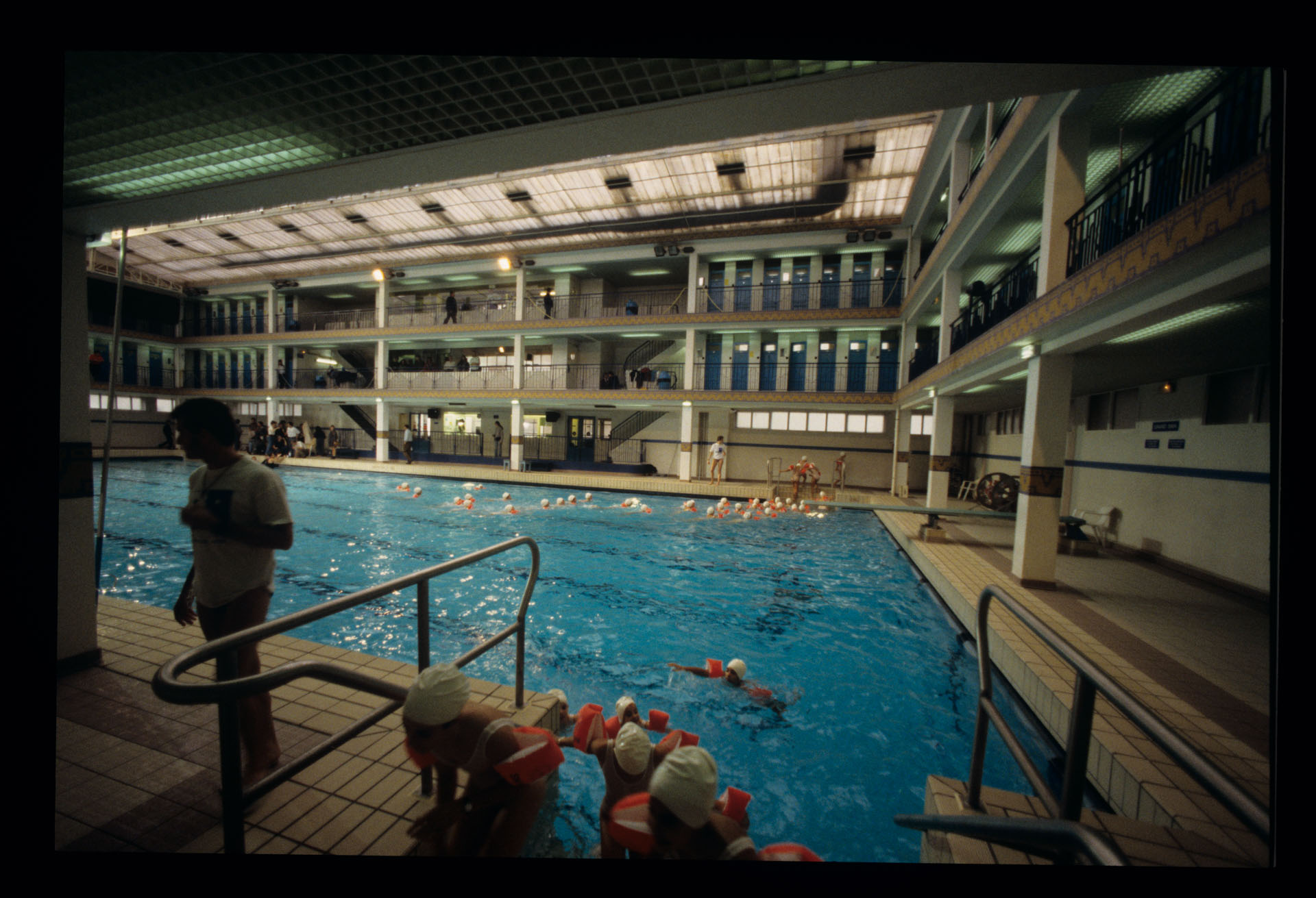 Grupa dzieci na basenie Piscine Pontoise w Paryżu, gdzie Julie, główna bohaterka filmu, systematycznie pływa.