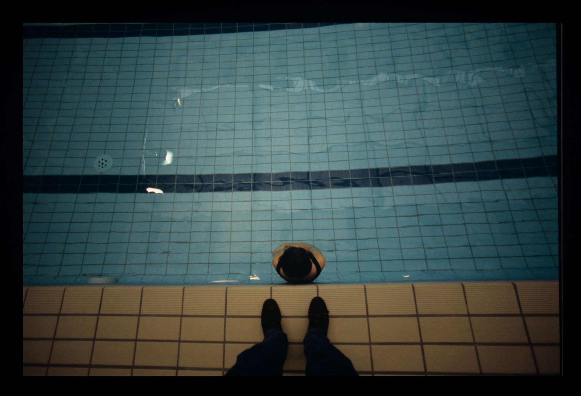 Ciekawe ujęcie na basenie. Juliette Binoche (jako Julie) opierająca się o brzeg basenu (w wodzie) oraz stopy fotografującej osoby.