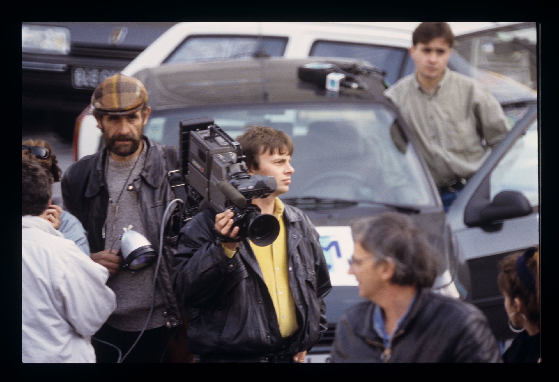 Grupa dziennikarzy oczekujących na rozmowę z reżyserem Krzysztofem Kieślowskim.