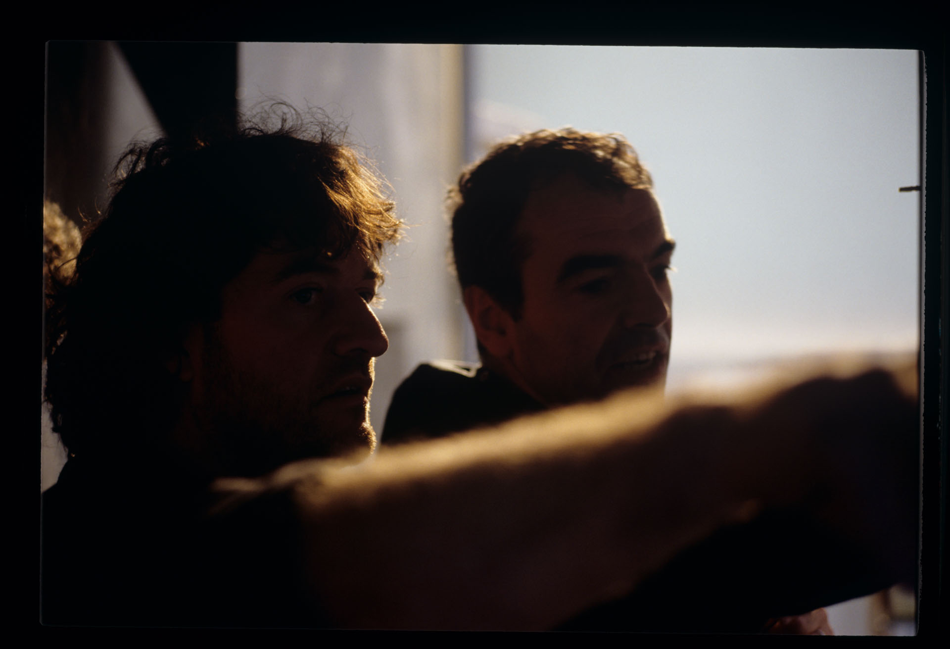 Sławomir Idziak (operator) i Hans Meier (szef ekipy oświetleniwej) podczas pracy na planie zdjęciowym.