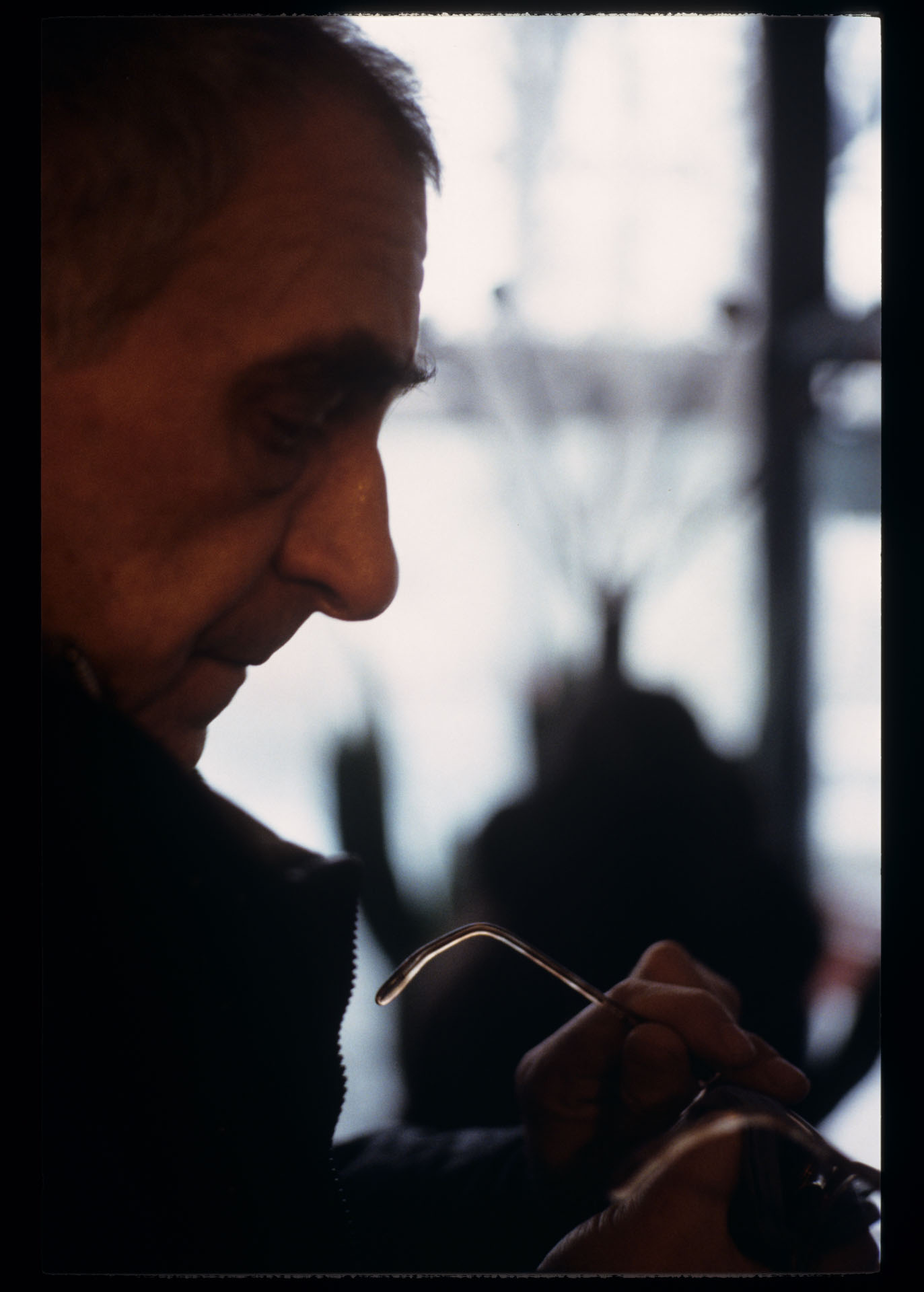 Krzysztof Kieślowski (reżyser) przecierający okulary na planie zdjęciowym.