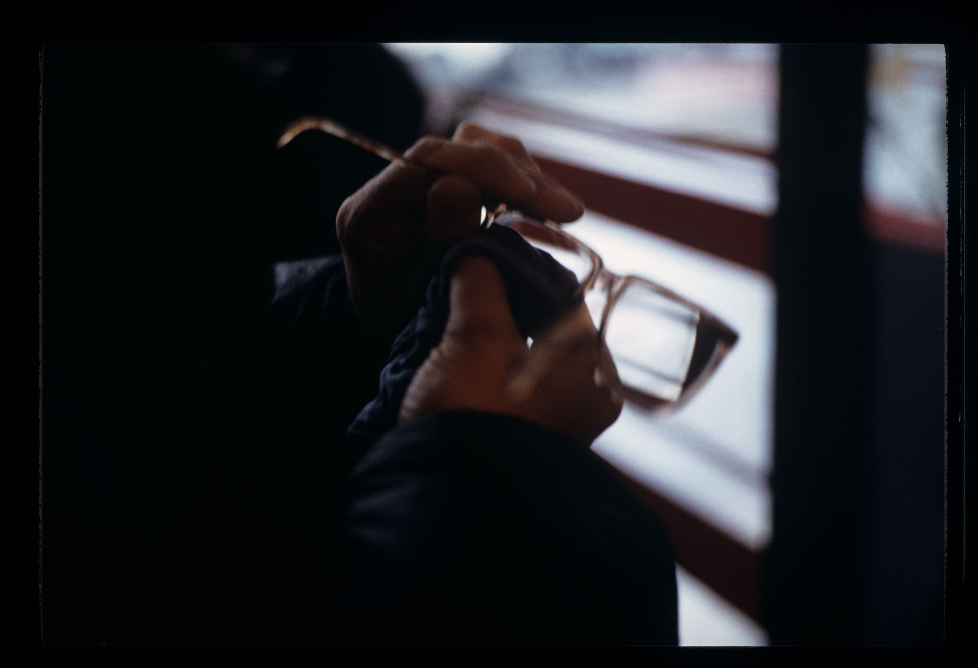 Krzysztof Kieślowski (reżyser) przecierający okulary na planie zdjęciowym.