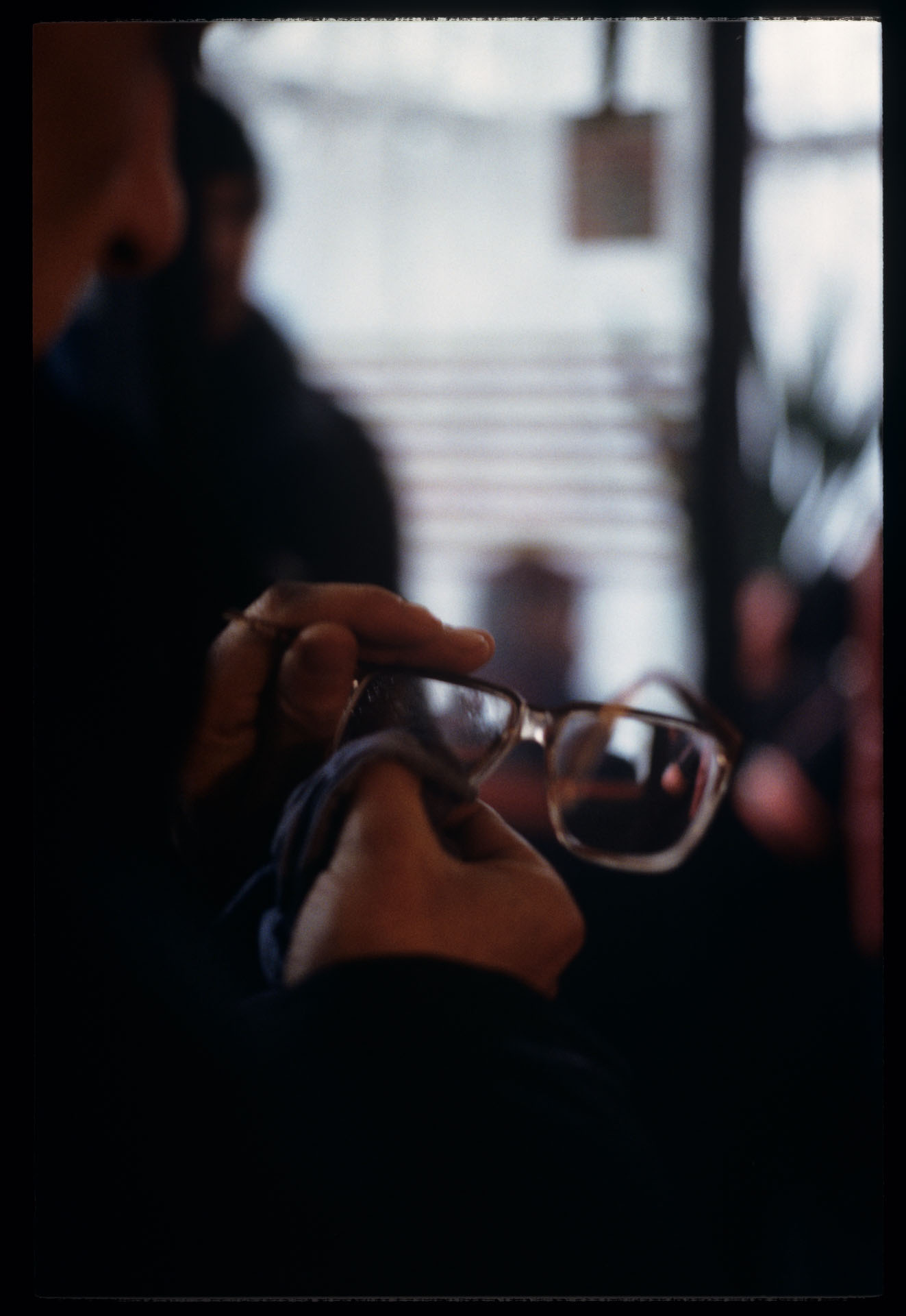 Krzysztof Kieślowski (reżyser) przecierający okulary na planie zdjęciowym.