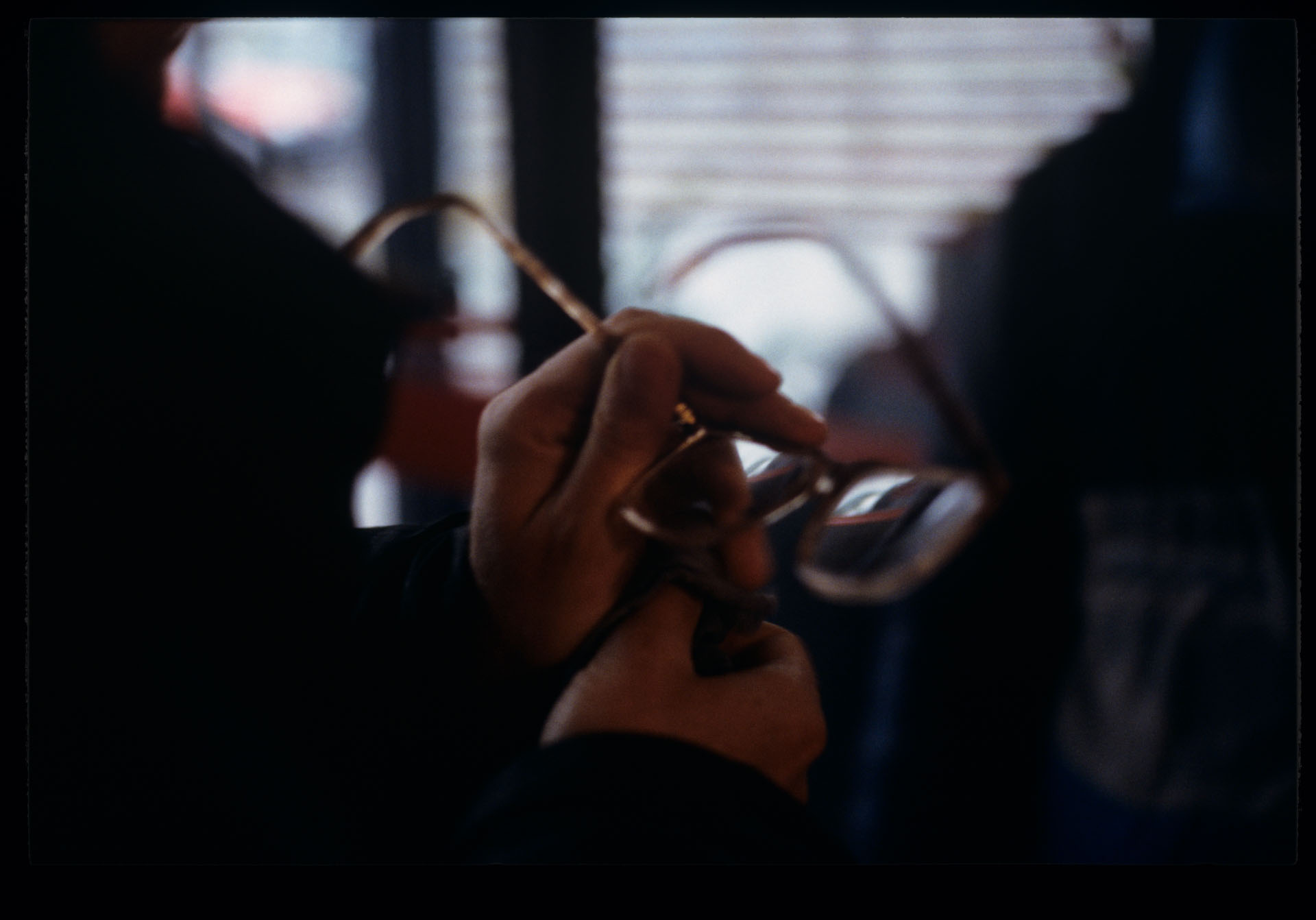 Krzysztof Kieślowski (reżyser) przecierający okulary na planie zdjęciowym.