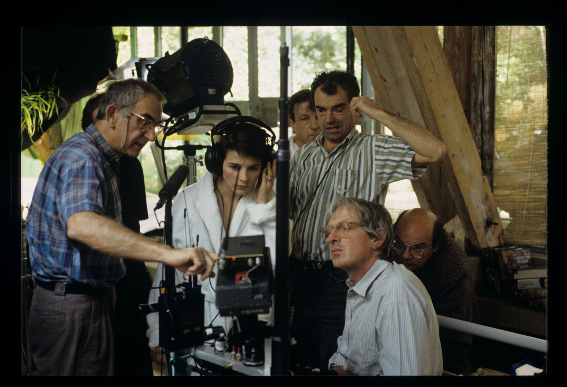 Juliette Binoche (odtwórczyni roli Julie), Krzysztof Kieślowski (reżyser), Slawomir Idziak (operator), Henryk Jedynak (asystent operatora), Jean-Claude Laureux (edytor dźwięku) i Stan Latek (współpraca reżyserska) analizują wcześniej nakręconą scenę.
