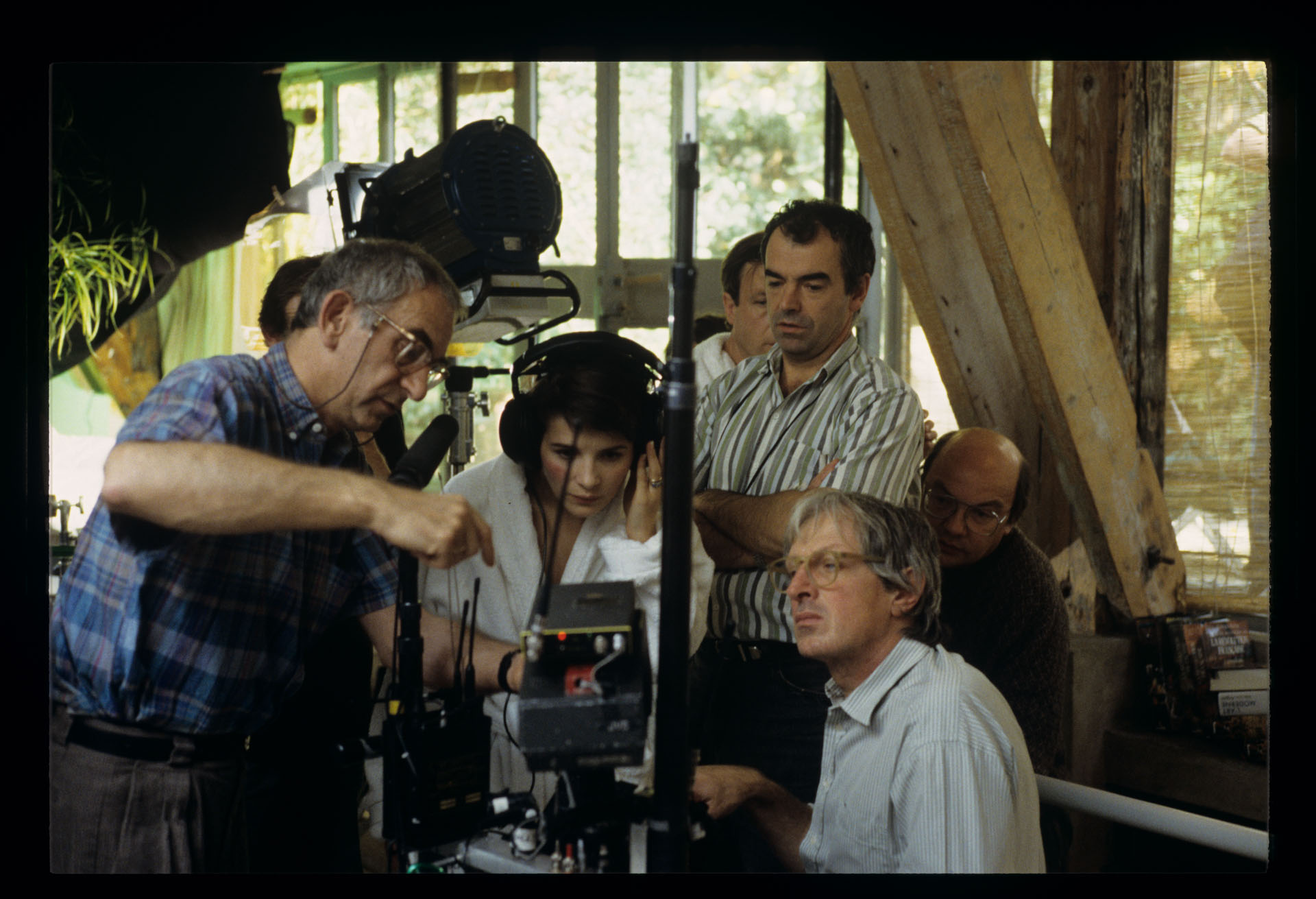 Juliette Binoche (odtwórczyni roli Julie), Krzysztof Kieślowski (reżyser), Slawomir Idziak (operator), Henryk Jedynak (asystent operatora), Jean-Claude Laureux (edytor dźwięku) i Stan Latek (współpraca reżyserska) analizują wcześniej nakręconą scenę.
