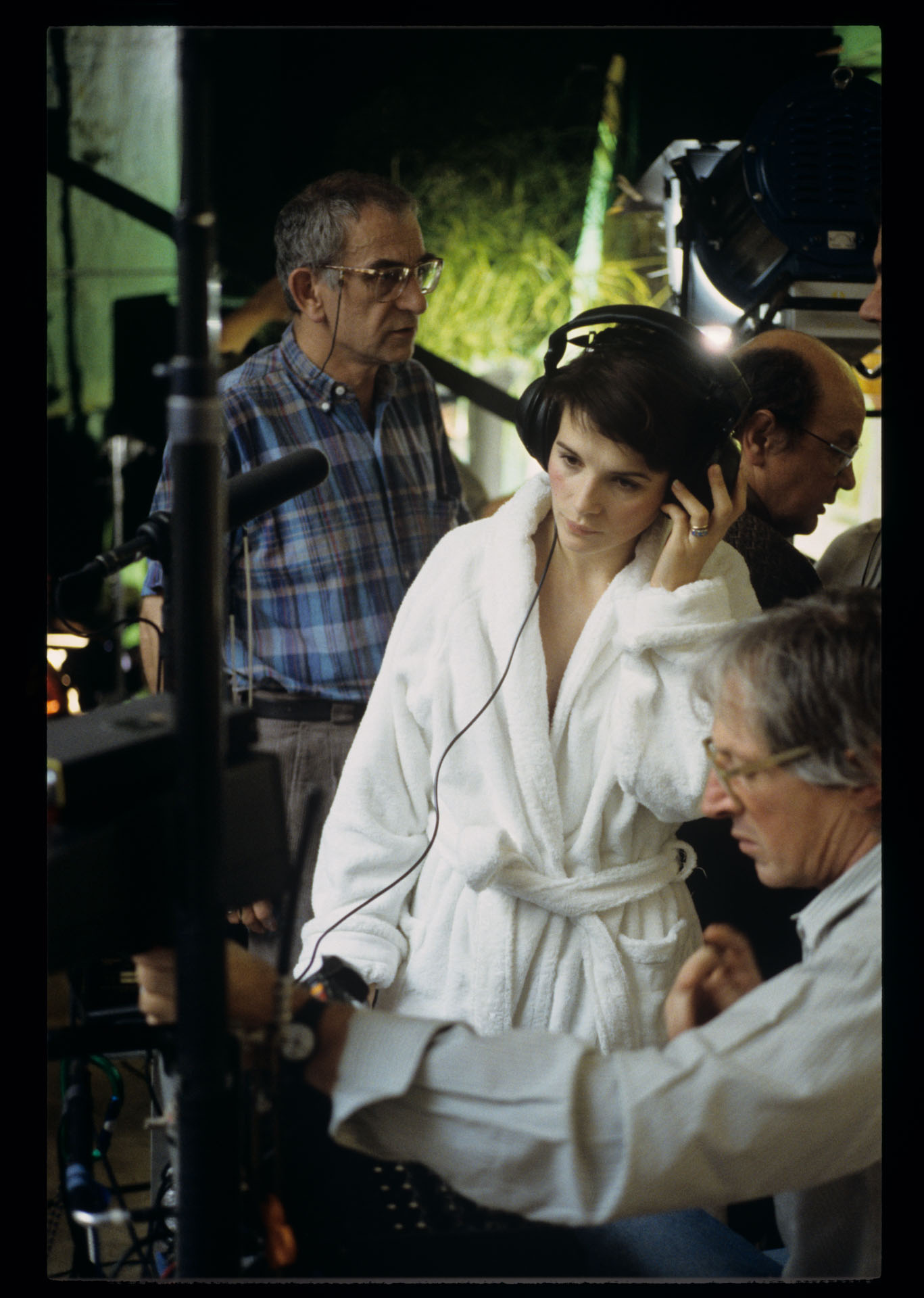 Juliette Binoche (odtwórczyni roli Julie), Krzysztof Kieślowski (reżyser), Slawomir Idziak (operator), Henryk Jedynak (asystent operatora), Jean-Claude Laureux (edytor dźwięku), Emmanuel Finkiel (współpraca reżyserska) i Stan Latek (współpraca reżyserska) analizują wcześniej nakręconą scenę.