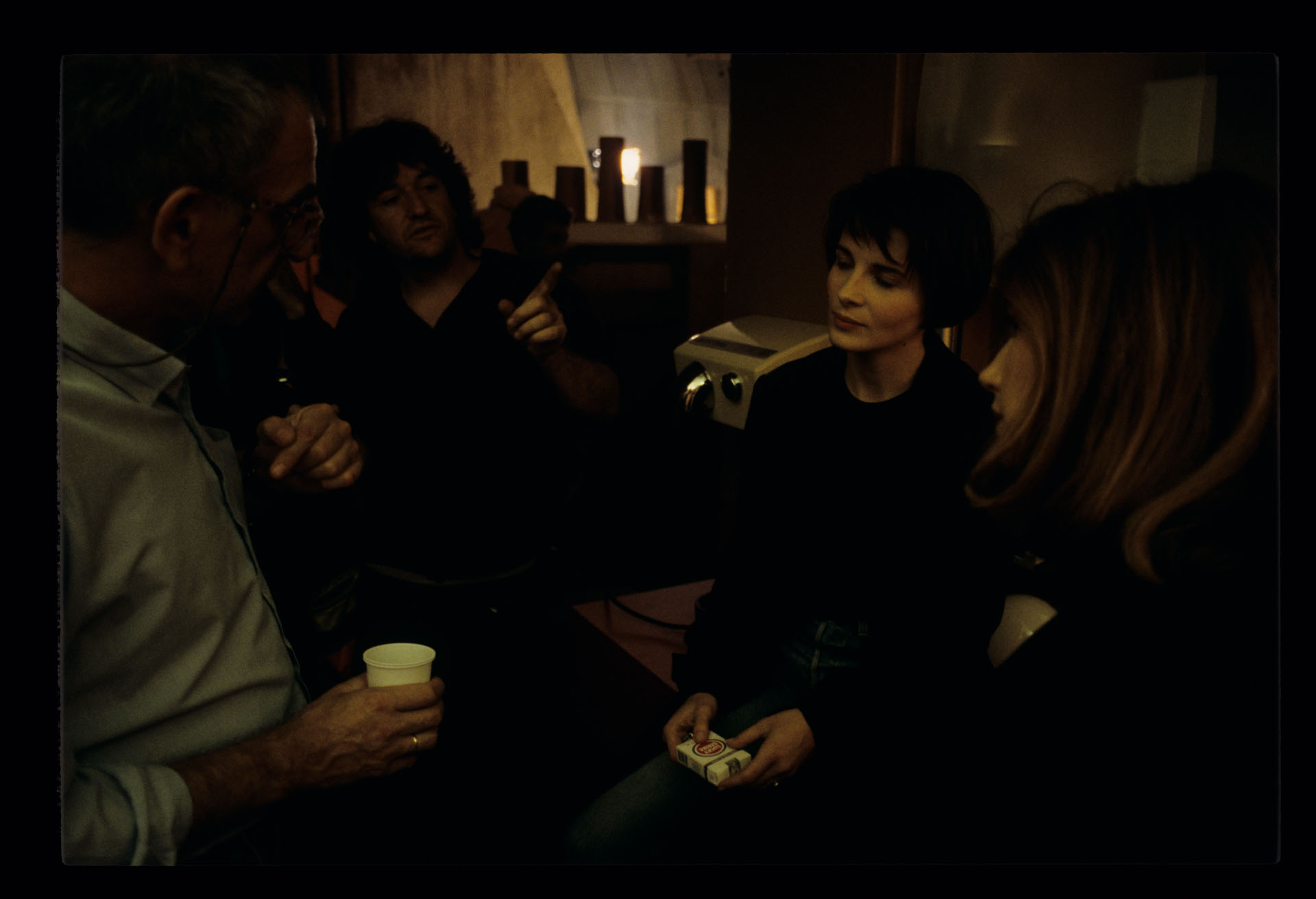 Aktorki Florence Pernel (odtwórczyni roli Sandrine) oraz Juliette Binoche (jako Julie) słuchają uwag reżysera Krzysztofa Kieślowskiego oraz szefa ekipy oświetleniowej Hansa Meiera podczas przygotowań do kręcenia sceny w toalecie kawiarni, podczas pierwszego spotkania Julie i Sandrine.