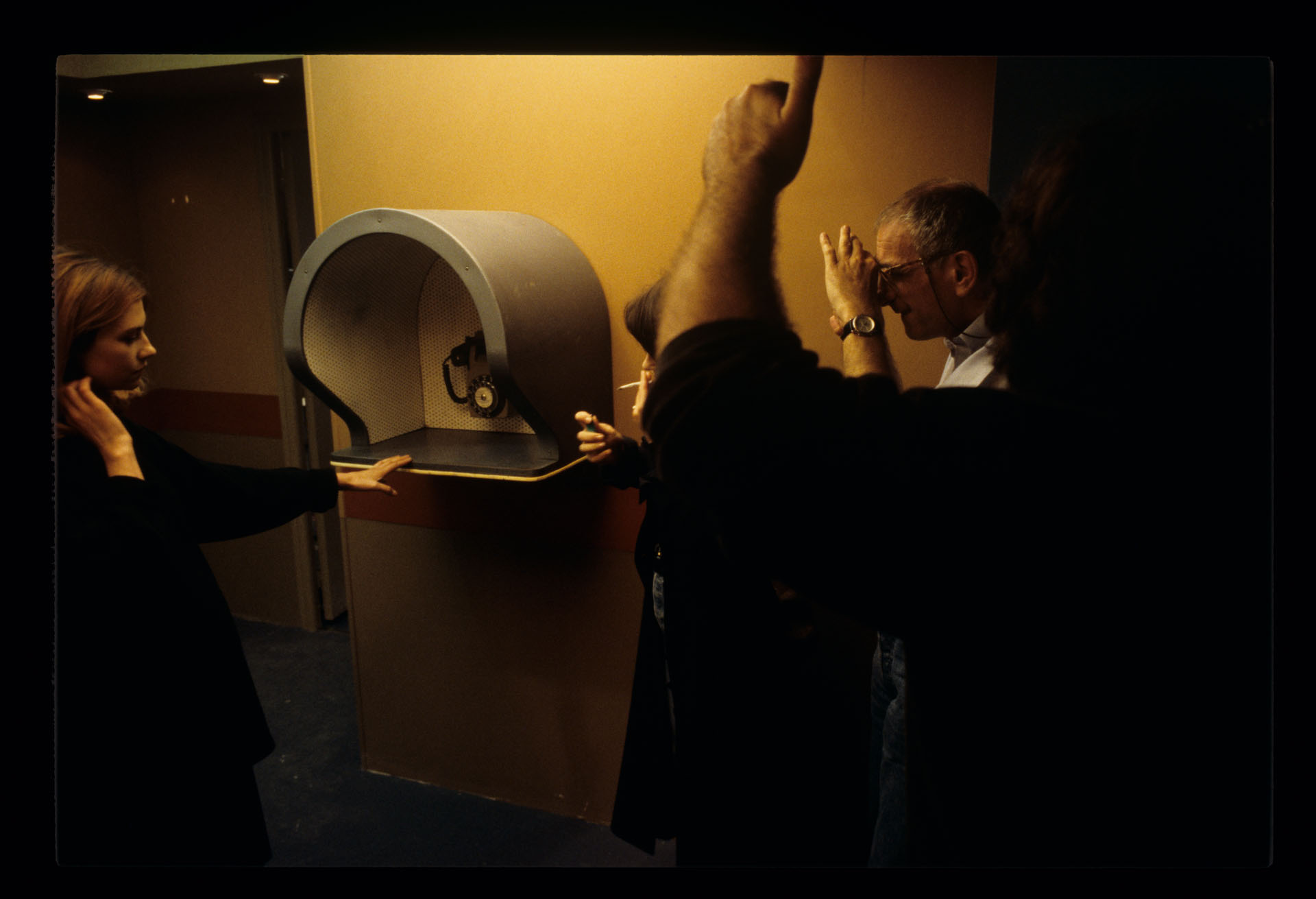 Ekipa na planie zdjęciowym podczas realizacji sceny w toalecie kawiarni, podczas pierwszego spotkania Julie i Sandrine. Na zdjęciu widoczni: Krzysztof Kieślowski (reżyser), Sławomir Idziak (operator), Henryk Jedynak (współpraca operatorska) oraz aktorki Florence Pernel oraz Juliette Binoche.