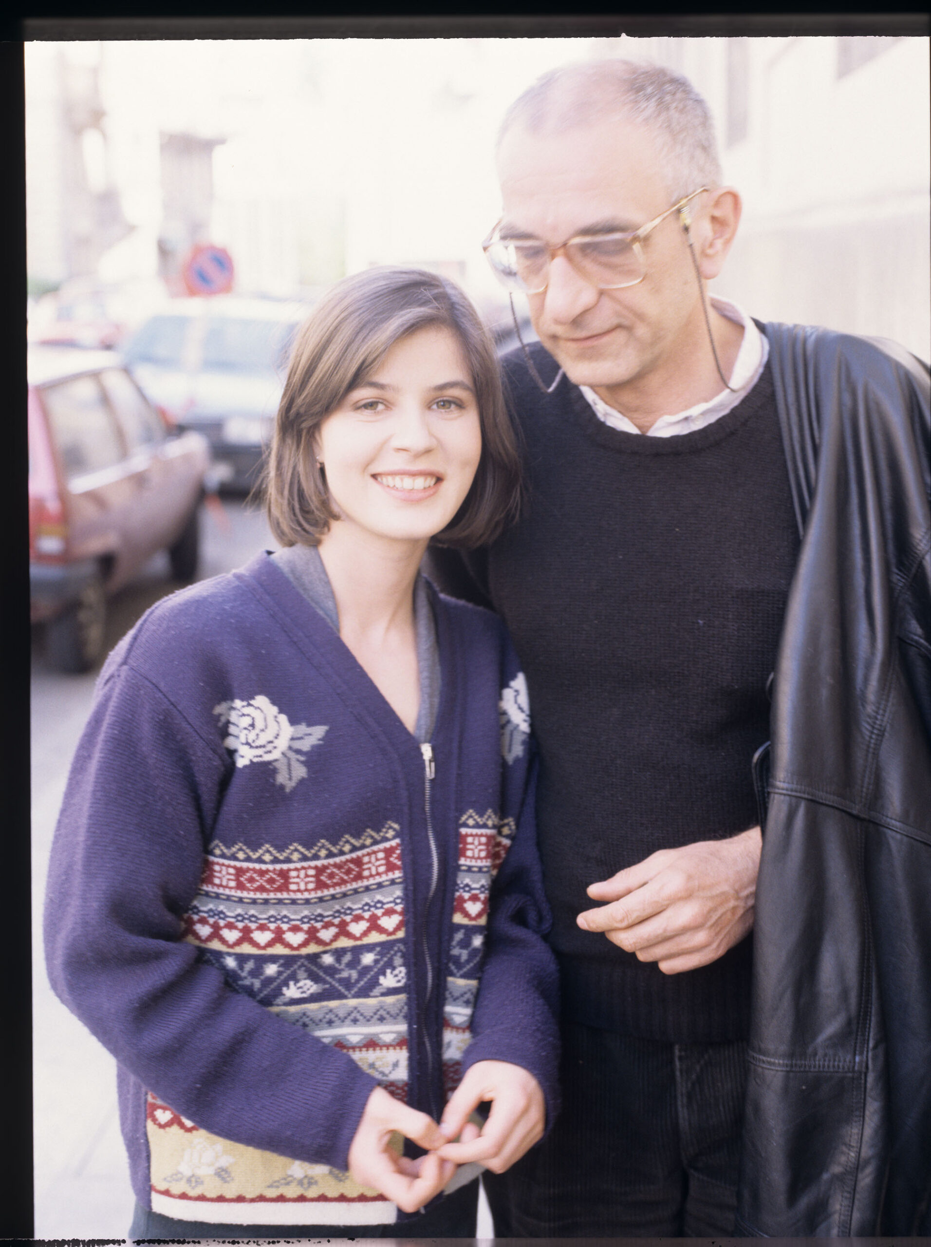 Pamiątkowe zdjęcie reżysera Krzysztofa Kieślowskiego i aktorki Irene Jacob w czasie kręcenia filmu Trzy kolory. Czerwony.