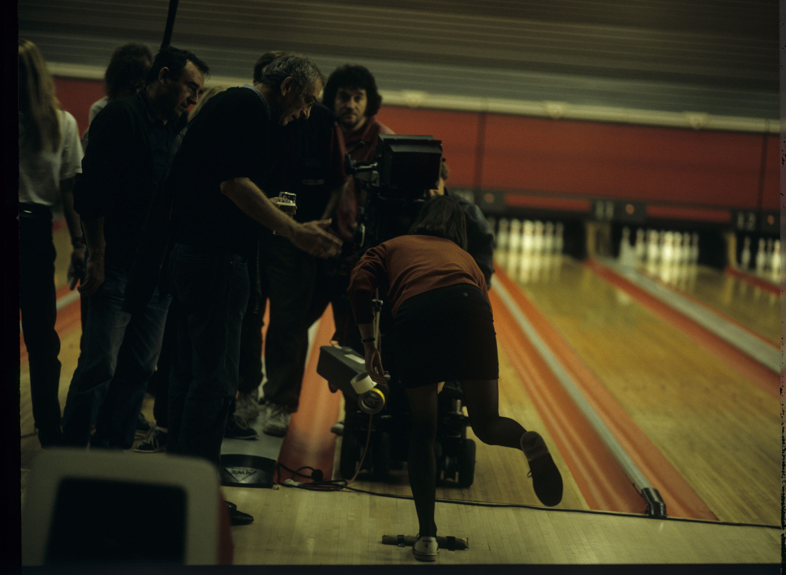 Przygotowania do kręcenia sceny w kręgielni. Krzysztof Kieślowski (reżyser) udziela wskazówek aktorce Irene Jacob. Za kamerą operator Piotr Sobociński, obok niego szef ekipy oświetleniowej Hans Meier.