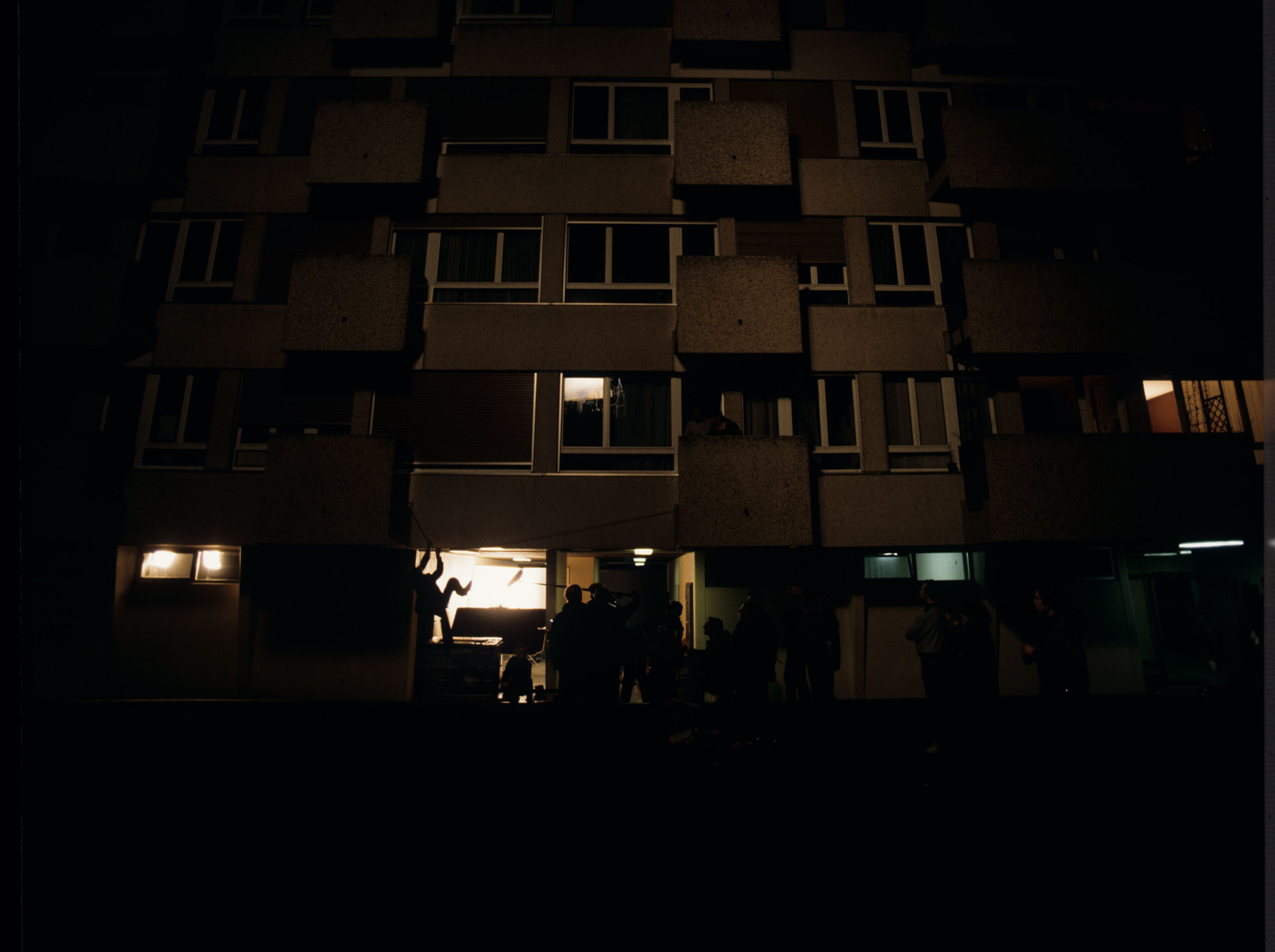 Kręcenie sceny pod budynkiem, kiedy Auguste (Jean-Pierre Lorit) wspina się po balkonach, aby zajrzeć przez okno do mieszkania swojej partnerki Karin