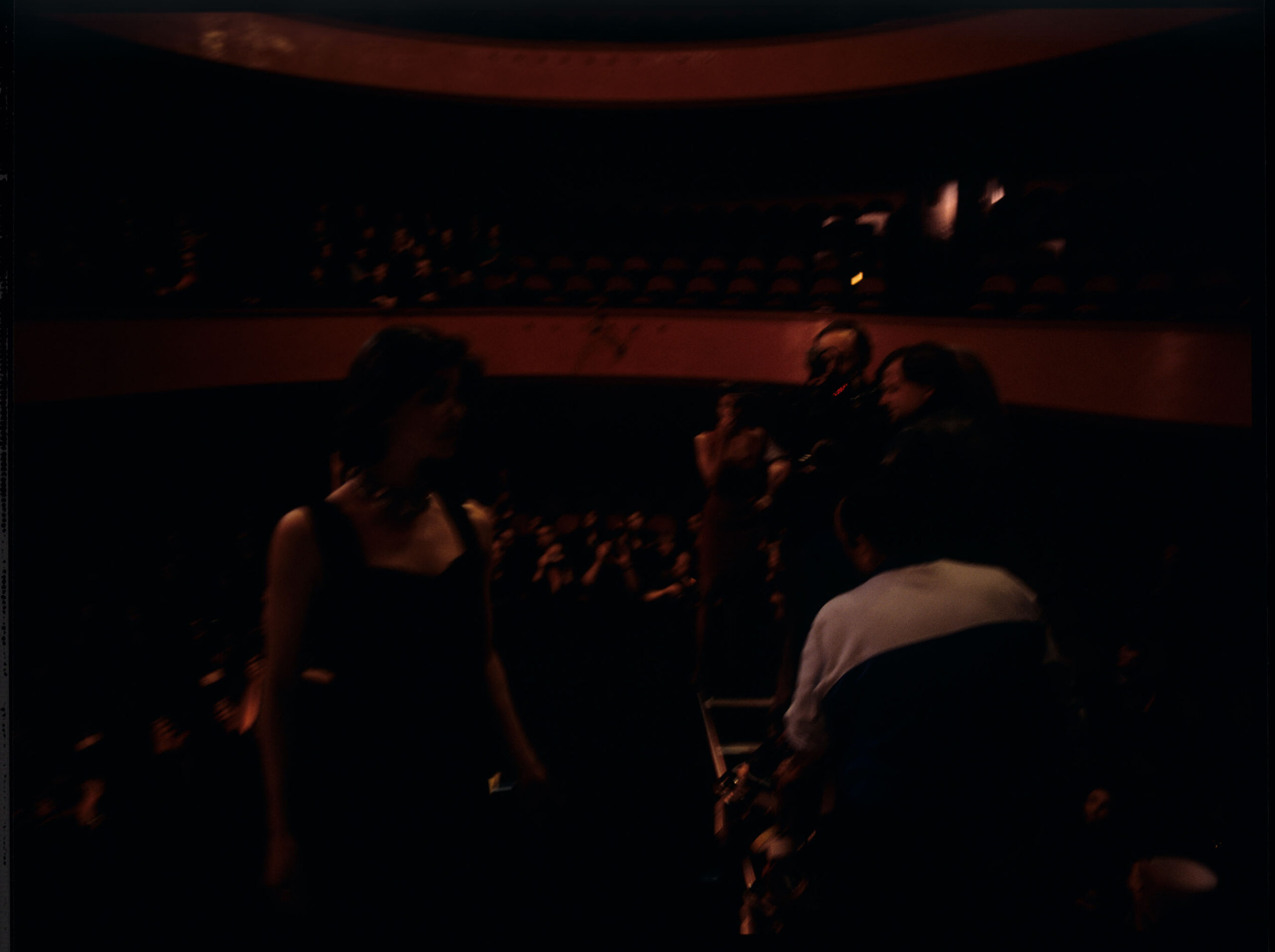 Kręcenie sceny pokazu mody w teatrze z udziałem Valentine. Na planie zdjęciowym aktorka Irene Jacob jako Valentine, operator Piotr Sobociński, reżyser Krzysztof Kieślowski, pozostali członkowie ekipy i statyści.