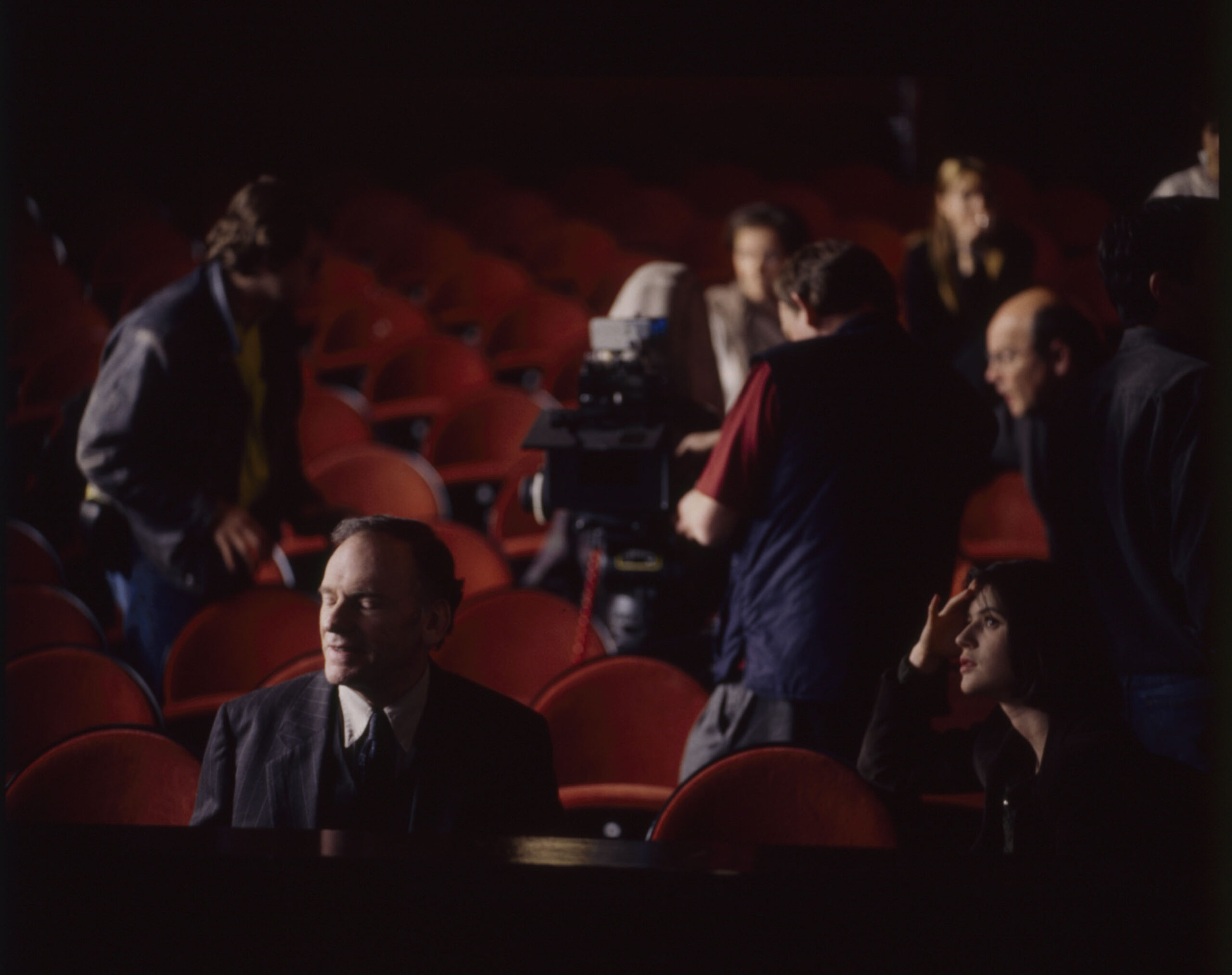 Kręcenie sceny spotkania emerytowanego sędziego Josepha Kerna i Valentine na widowni teatru po pokazie mody. Na zdjęciu aktorzy Irene Jacob i Jean-Louis Trintignant, operator Piotr Sobociński, asystent operatora Henryk Jedynak, asystent reżysera Stan Latek, sekretarka planu Genevieve Dufour.