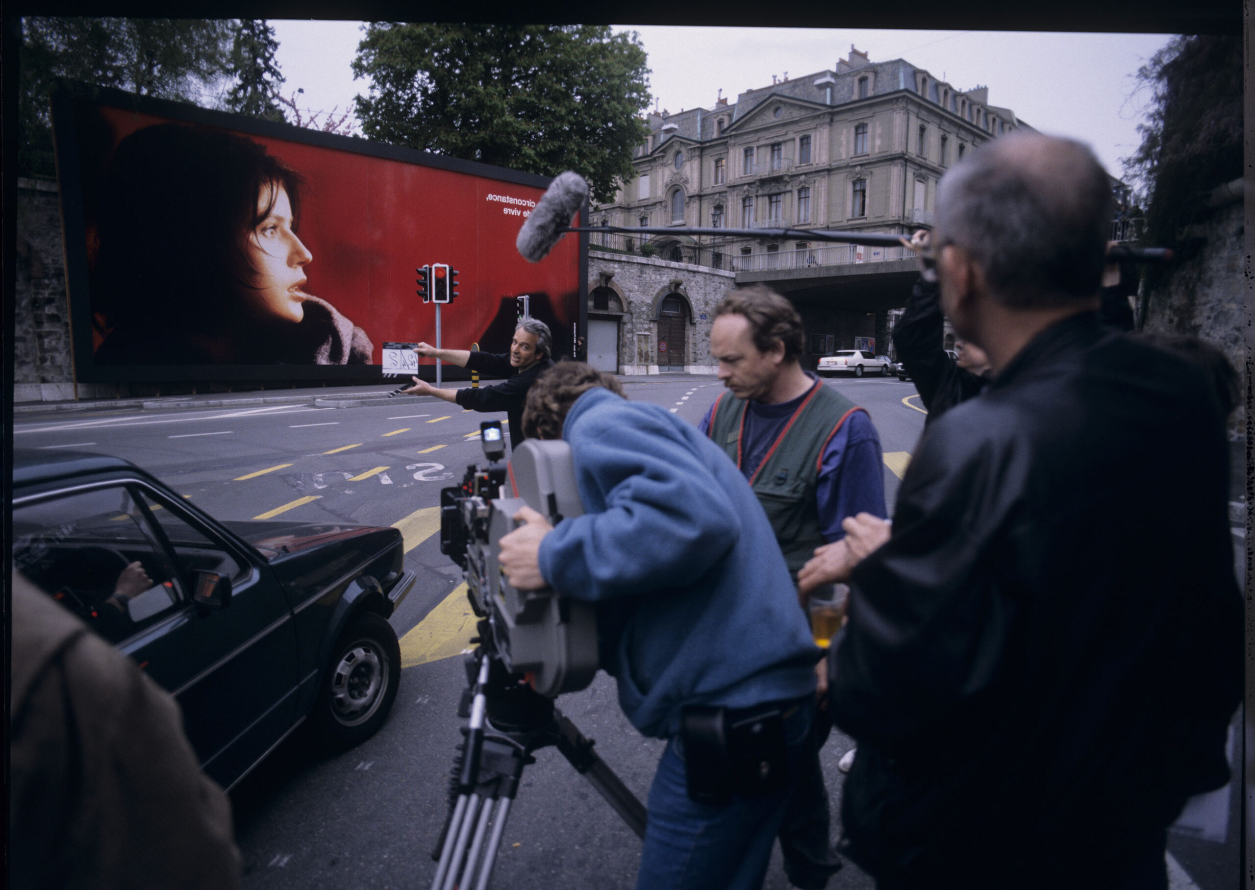 Kręcenie sceny przejazdu samochodu sędziego obok billboardu reklamowego z podobizną Valentine na genewskiej ulicy. Na zdjęciu reżyser Krzysztof Kieślowski, operator Piotr Sobociński i jego asystent Henryk Jedynak. Zdjęcie jest lustrzanym obiciem rzeczywistości.