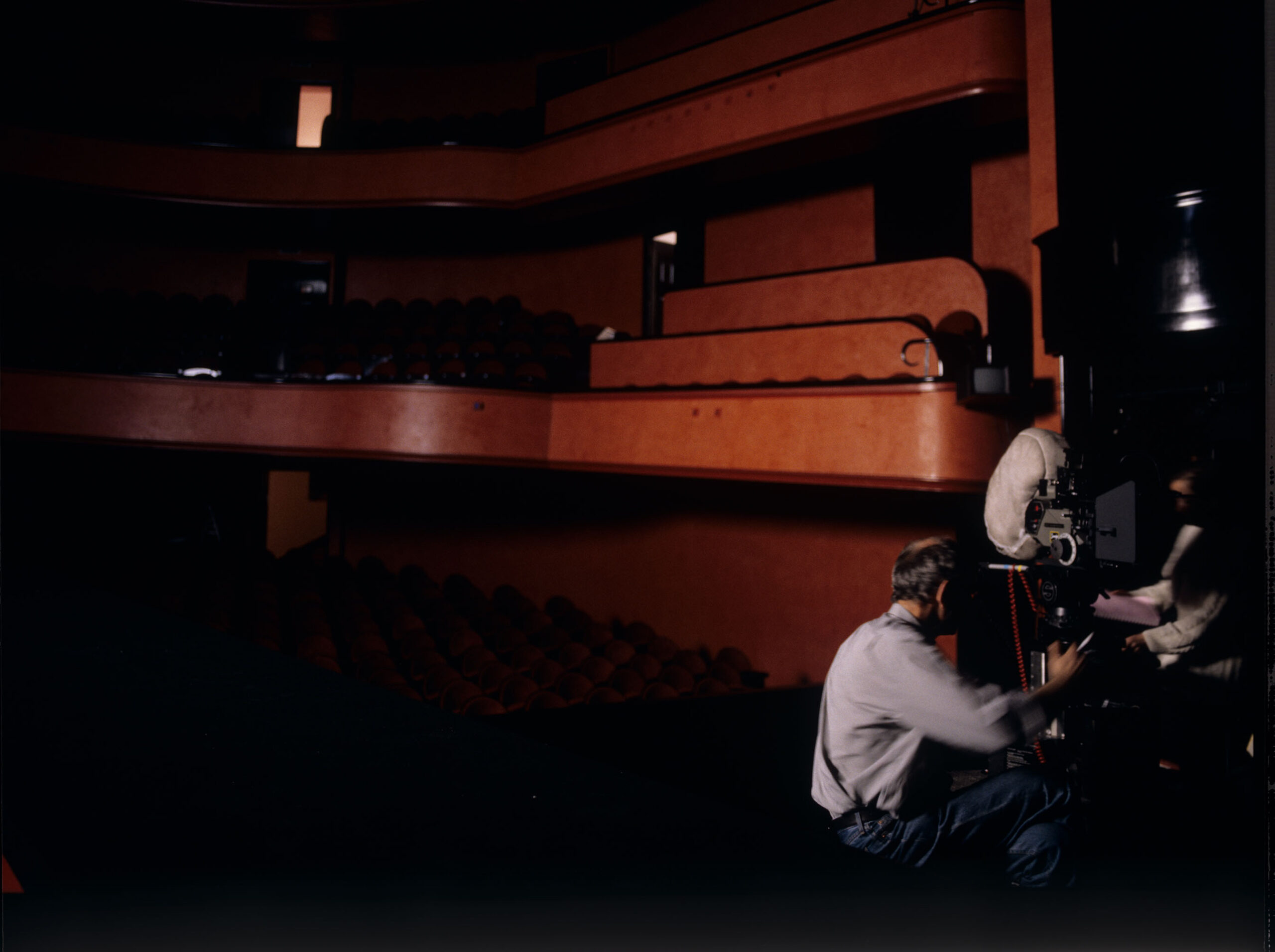 Krzysztof Kieślowski (reżyser) na planie zdjęciowym na widowni teatru podczas kręcenia sceny spotkania Valentine i sędziego.
