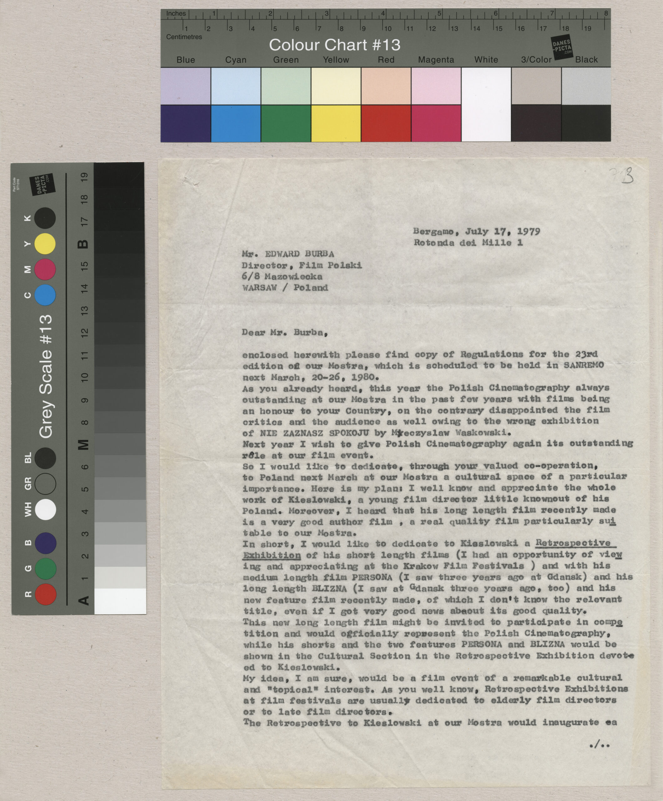 A typescript copy with the letter from Nino Zucchelli, director of “Mostra Internazionale del Film d’Autore” to Edward Burba, director of Film Polski, arguing for the idea of showing the films “Persona” and “The Scar” as part of the film festival in Sanremo in Italy and other short films by Krzysztof Kieślowski as part of the “Retrospective Show” – a film retrospective of the director. The author of the letter argues for this with his private impressions after watching Krzysztof Kieślowski’s feature films at the Krakow Film Festival and short films at the Feature Film Festival in Gdańsk. In his argument, he also mentions the successes of other Poles showing their films in Sanremo, including Mieczysław Waśkowski with his film “You Will Not Find Peace”. There is also a mention that the author of the letter has already discussed this idea with Barbara Czyżewska-Nowosad, who is present every year at the Sanremo Film Festival as an official representative of Film Polski. Additionally, the author of the letter also mentions a new feature-length film by Krzysztof Kieślowski, which is currently being made – in the context of showing it at the Sanremo Film Festival in the future. The letter is an attachment to a letter from Nino Zucchelli, director of “Mostra Internazionale del Film d’Autore” to Krzysztof Kieślowski, reference number ATKK-BLI-I-009.