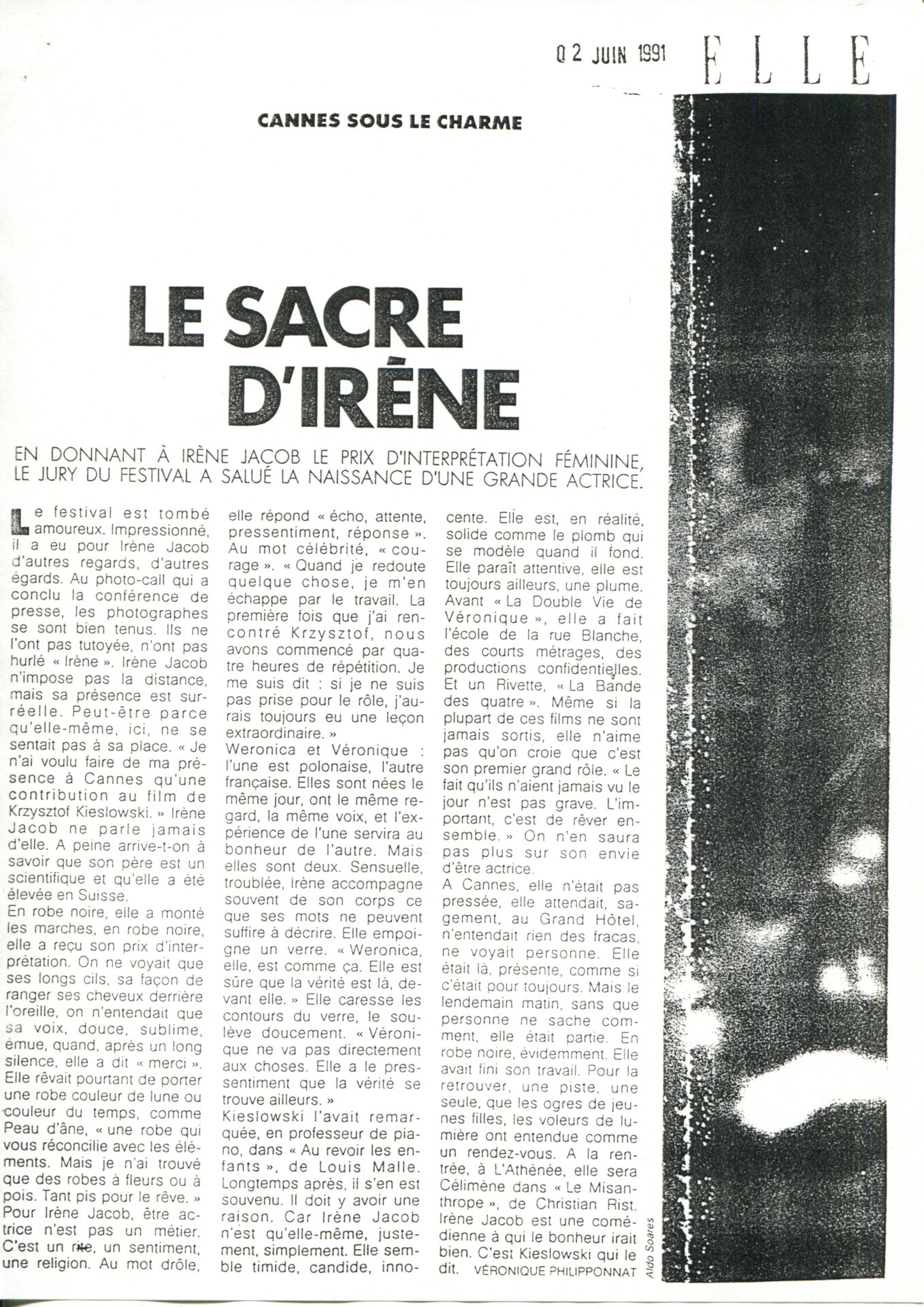 Press article from the French newspaper “Elle” entitled “Le Sacre D’Irene”.