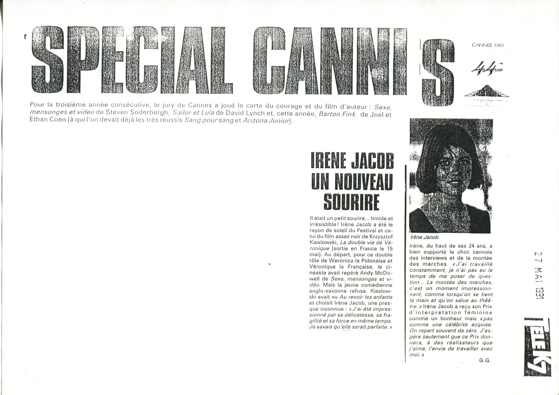 Press clipping from the French newspaper “Tele K7” entitled “Irene Jacob un nouveau sourire”.