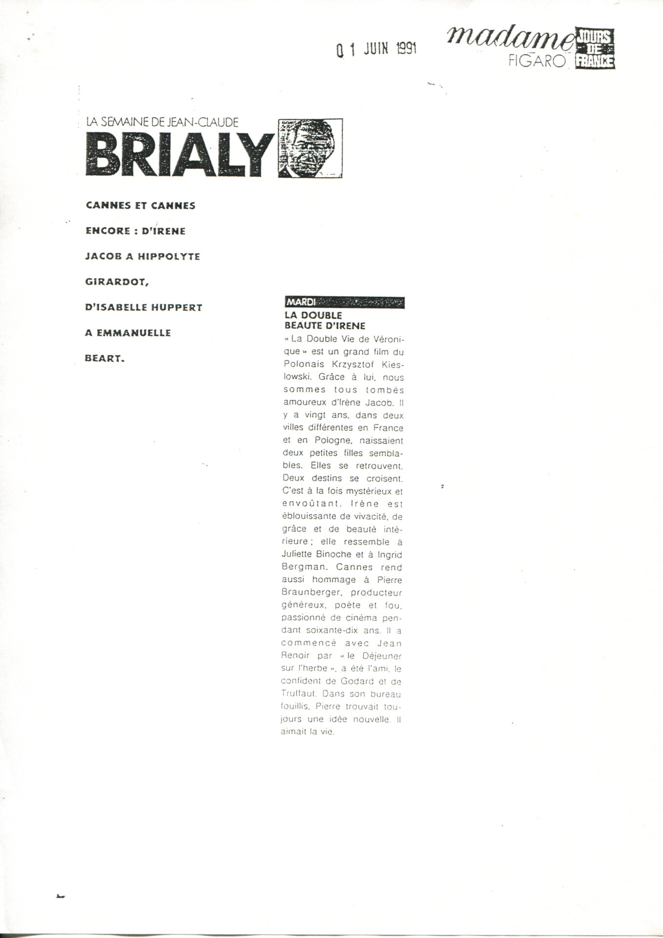 Press clipping from the French newspaper “Madame Figaro” entitled “La double beaute d’Irene”.