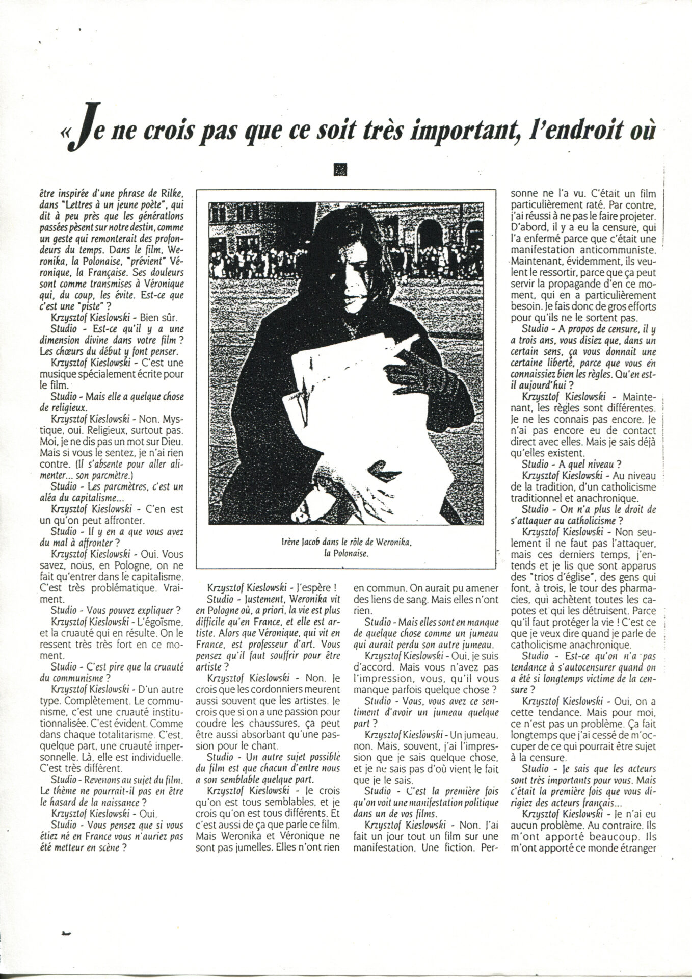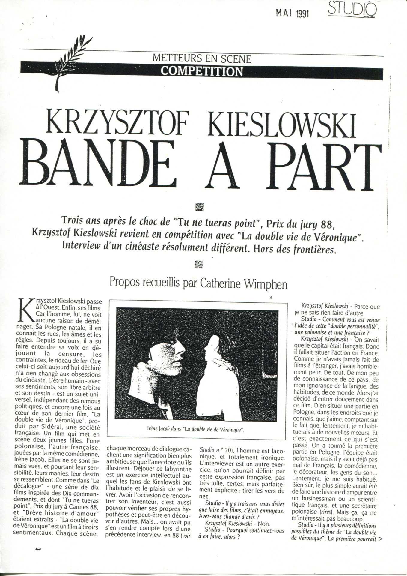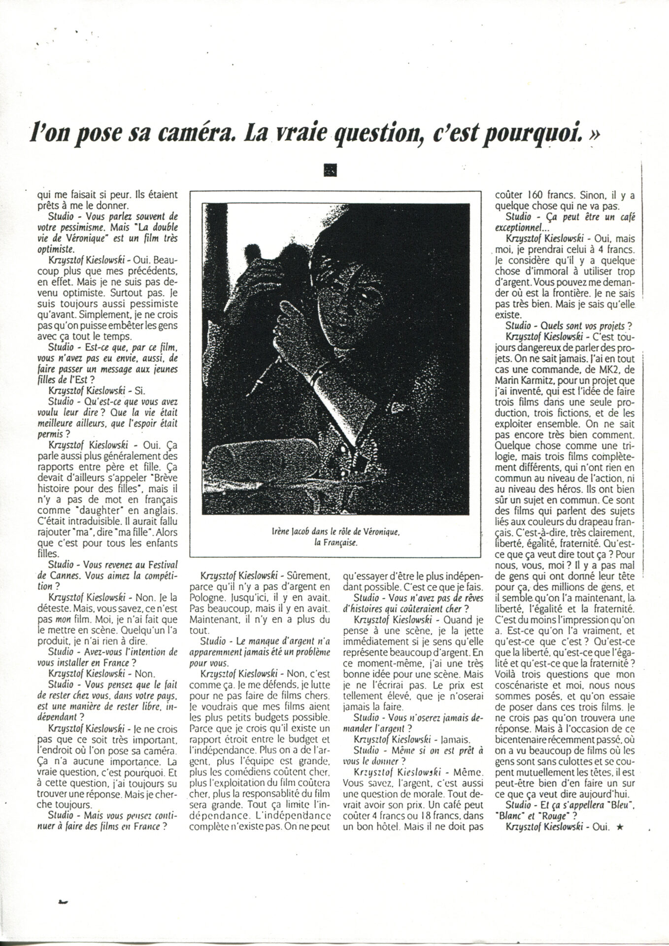 Press article from the French newspaper “STUDIO” entitled “Krzysztof Kieslowski Bande a Part”.