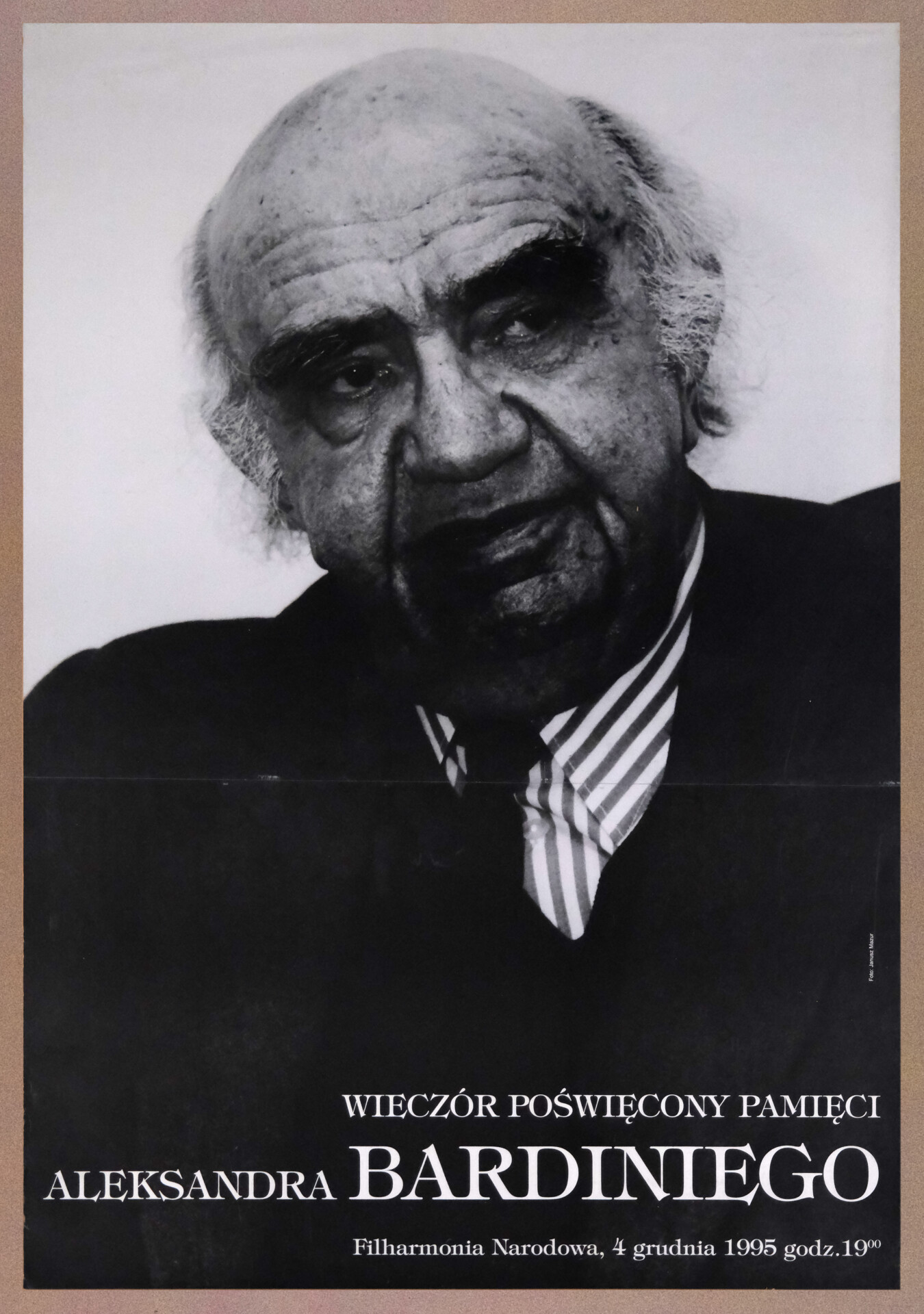 The poster for an event “An evening dedicated to the memory of Aleksander Bardini”. Aleksander Bardini, an outstanding theatre and film actor, appeared in several films by Krzysztof Kieślowski, including “Dekalog II”, “Blind Chance”, “The Double Life of Veronique”, and “Three Colors. White”.