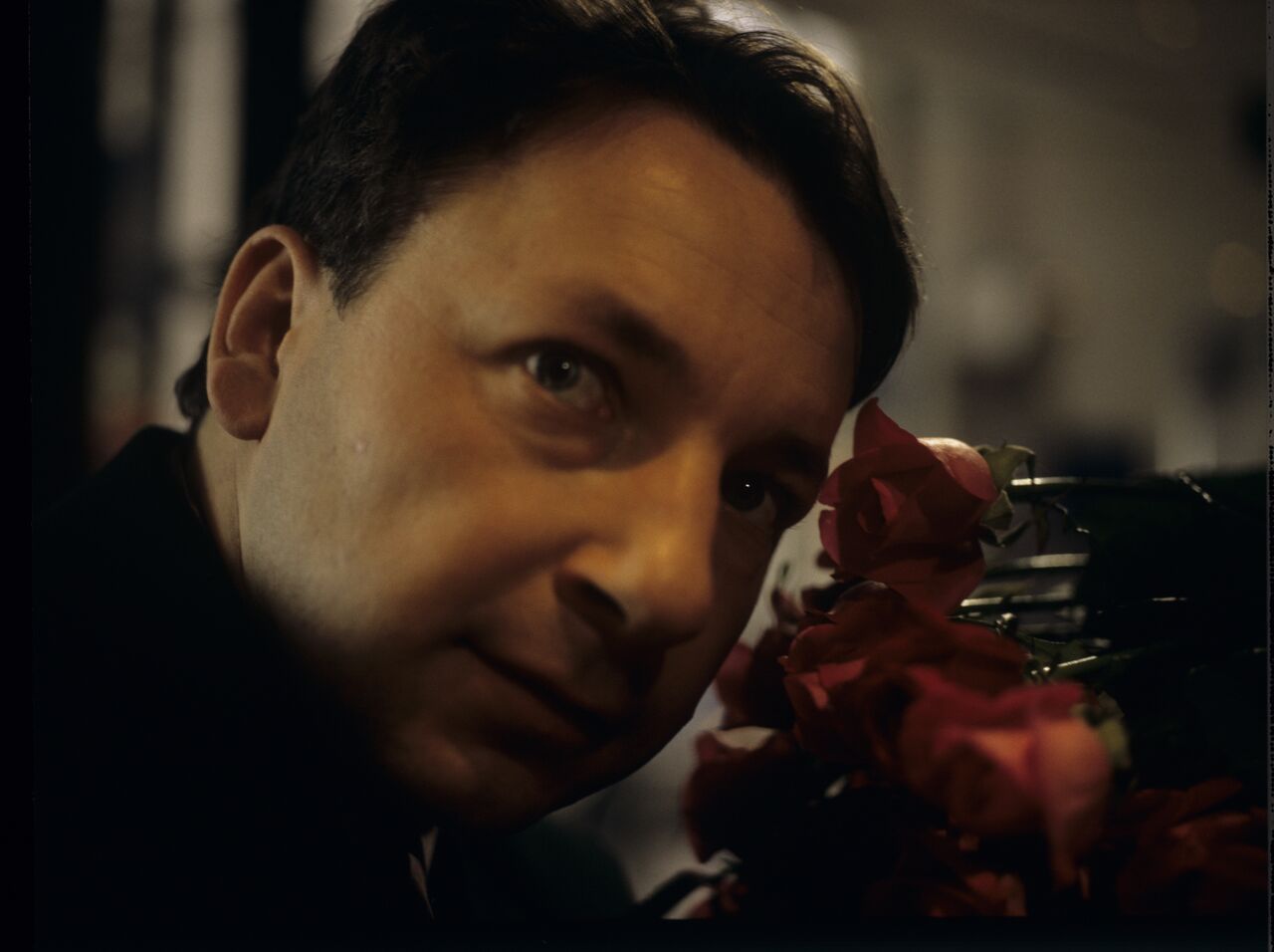 Karol (Zbigniew Zamachowski) with a bouquet of flowers. The scene did not appear in the film.