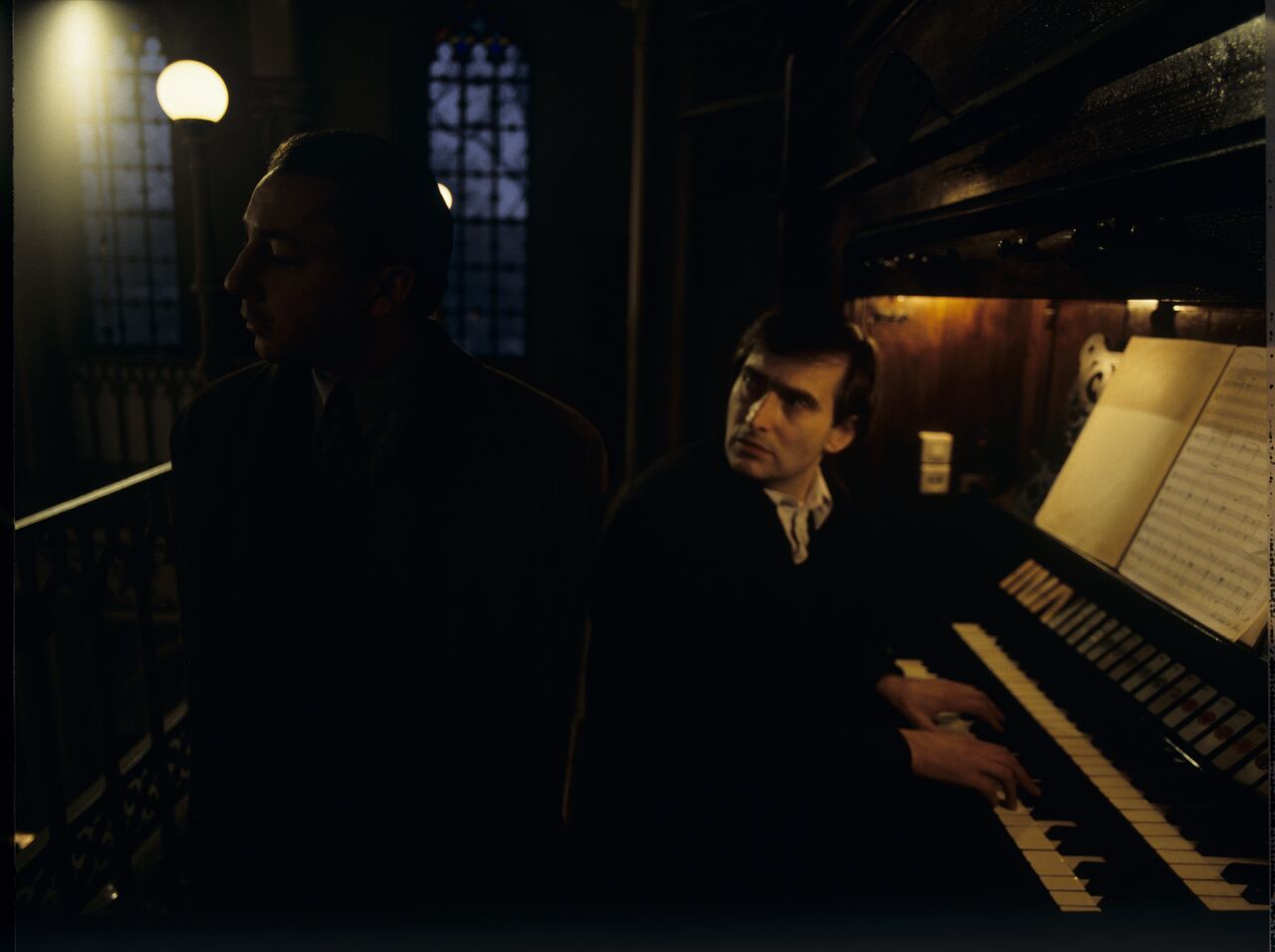 Photo from a scene that was not in the film. On the photo: organist (Olgierd Łukaszewicz) and Karol (Zbigniew Zamachowski) preparing for Karol’s fake funeral